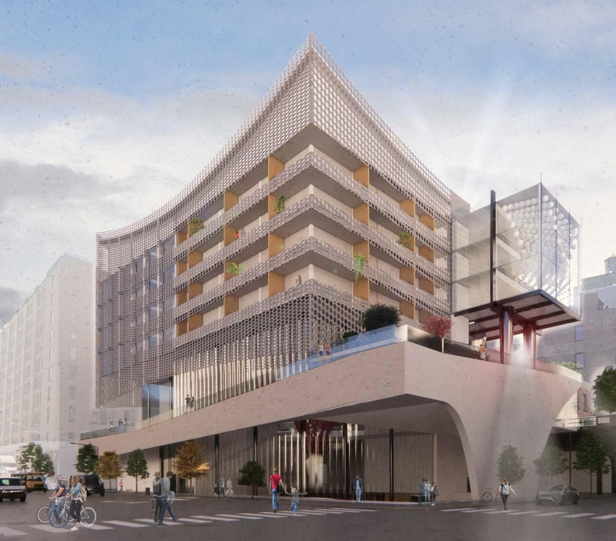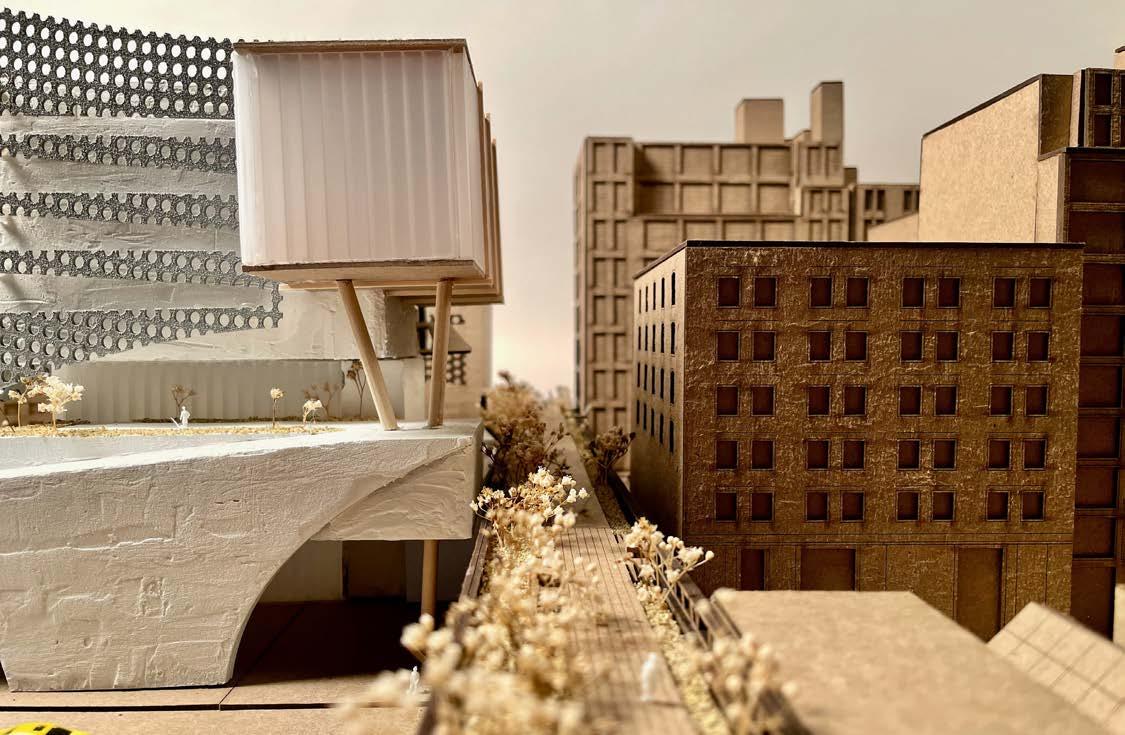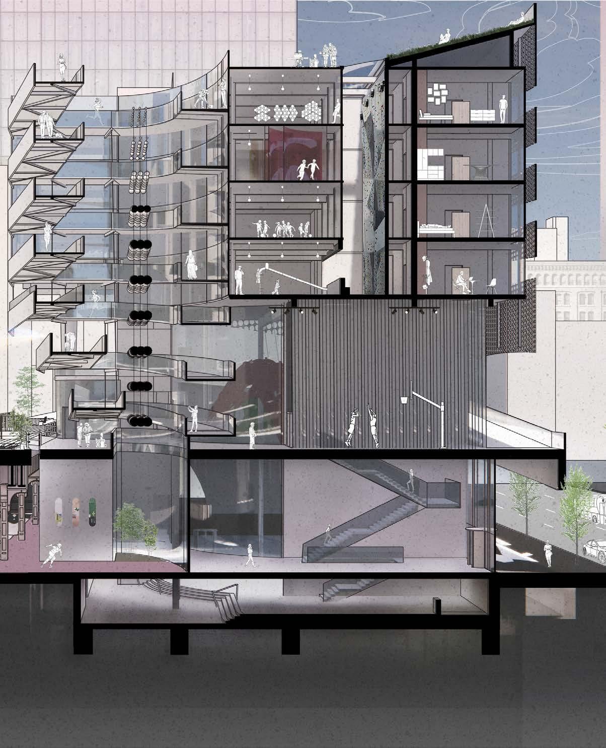 THE ARC aims to provide artists of all ages and all family situations with an active place to live, where the public has access to interacrtive exhbition spaces, community art studios, and dynamic activity areas above the popular High Line linear park. An inviting slope encompasses the base of the complex drawing street level pedestrians upwards, with a half-circle ramp continuing the jorney to the bowl shaped rooftop amphitheater. The exterior skin shields residences from direct sun rays and provides pockets of privacy, while the highly transparent studio wing is wedged above, drawing interest to the interactive art installations within.