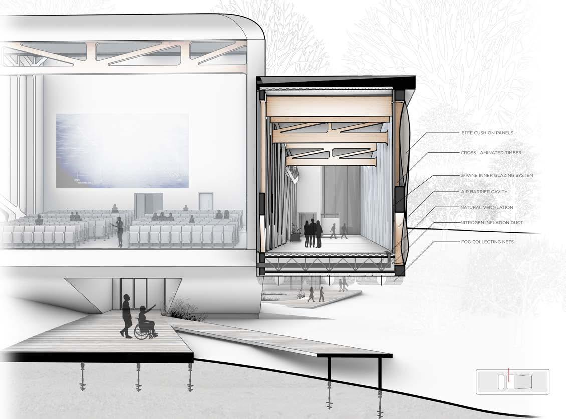 To open the minds of the community to protect and improve our waterscapes both locally and globally, we are proposing WICK, a center to showcase and develop strategies to generate, conserve, and manage water in new ways. On the site, over 23 million gallons of water fall annually, draining from impervious surfaces into the wooded site. Rather than blocking this flow, WICK hovers above the landscape on dual cores, straddling natural drainage routes. Inside, collected water is used in the toilets and conditioning system, while some are purified for consumption and inhouse hydrology research purposes. Additional water is extracted from the air via exterior fog-collecting mesh baffles and micro ridges on the surface of the ETFE facade, capable of collecting additional water in humidity and fog events.