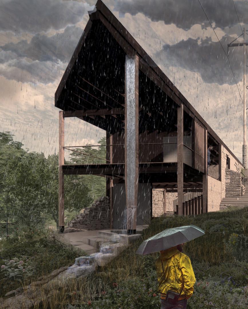 Managing the harsh and unpredictable weather of Iowa’s distict seasons required considering how rainwater, drought, intense sun, and wind would affect the intervention. A semi-subterranean stucuture helps regulate temperatures without need for active systems, and nat ural ventilation draws cool air from the valley below through the building and out exhaust chutes.