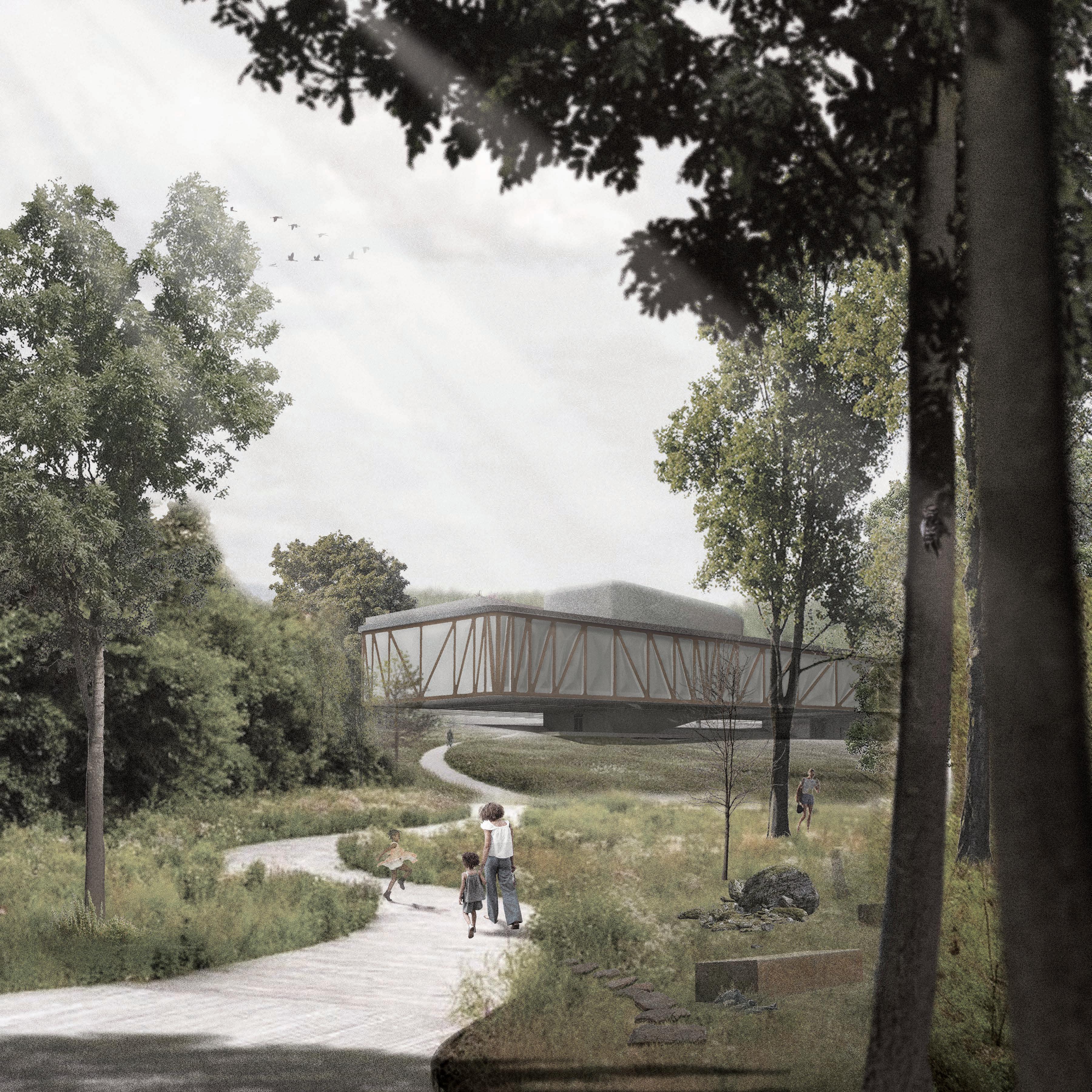 The space serves as a facility which supports the education and removal of invasive species. It also features a water channel which flows through the landscape to the main building and subsequently to an outstretching rain garden below. Facilitation of these programs is ideally located in a transmission line slot as it reveals the dramatic topography of the land, serves as a symbolic break in the landscape, represents the epicenter of invasive expansion, and acts as an ecologically responsible site for human interruption.