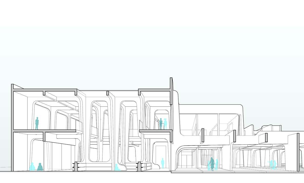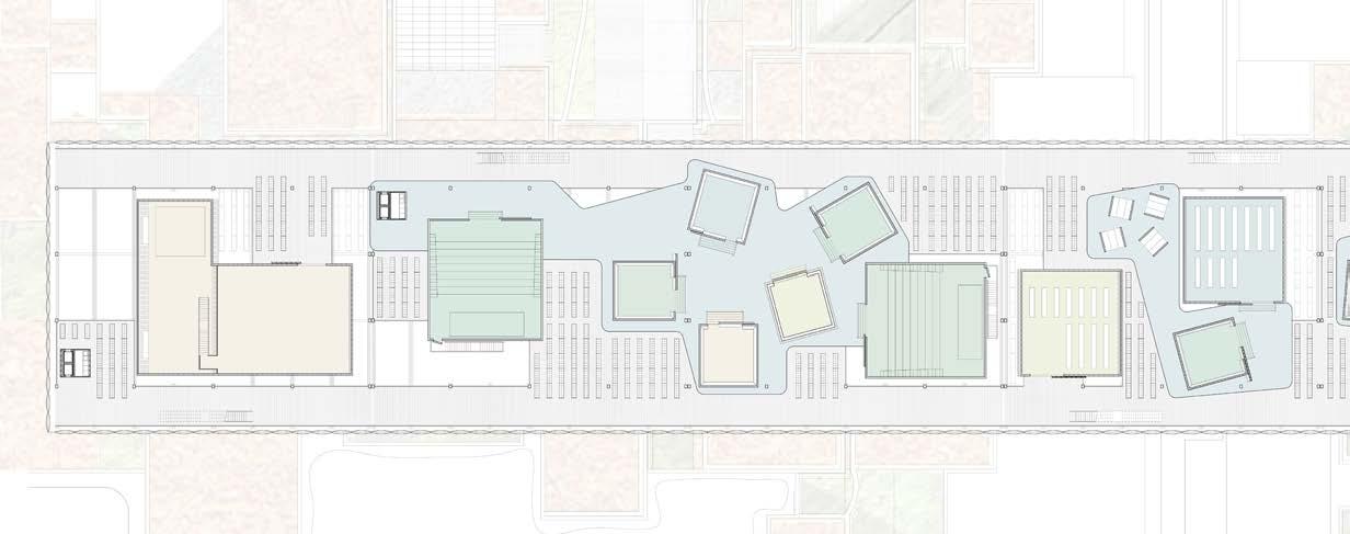 Formally, a gridded series of unique and custom designed planes. each plane is shaped by the programmatic needs of each thematic zone of the grid. The true potential of the individualized planes is realized in the fluid reading between plan, section, axonometric, and perspective views. The planes further beyond formal and programmatic motivations, directly dictating spatial division, embedding circulation and offering functional engagements in order to achieve a participatory and experiential architecture. The formal interlocking of the planes is symbolic of the interconnectivity between the programs supported and ownership potential to the community.