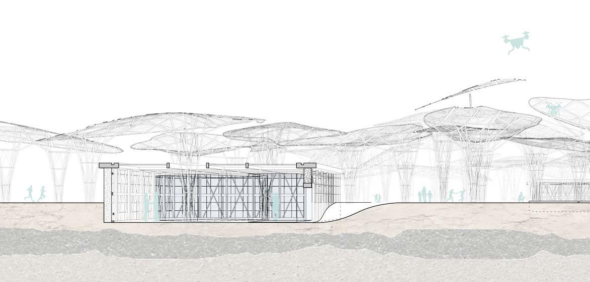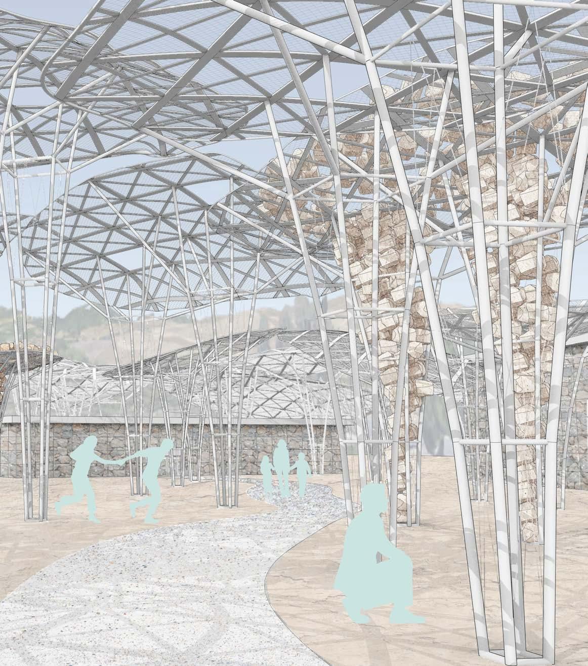 The primary projection is the intentional use of found, common ground stones as the building’s material system, which repurpose existing materials from local, abandoned deposits and visually conforms with the iconic vineyard landscape. The enclosure system of programmatic spaces and some of the petalform pavilion roofs employ the ancient gabion construction technique. The gabion method passively cools and shades the complex, accommodating the local climate, as well as produces an organic and monumental experience for visitors. Shadows are cast as spontaneous fractures from the gabion elements and as regular line networks from the steel-webbed pavilion petal-forms, blending the historicalindigenous and the modern in harmony.