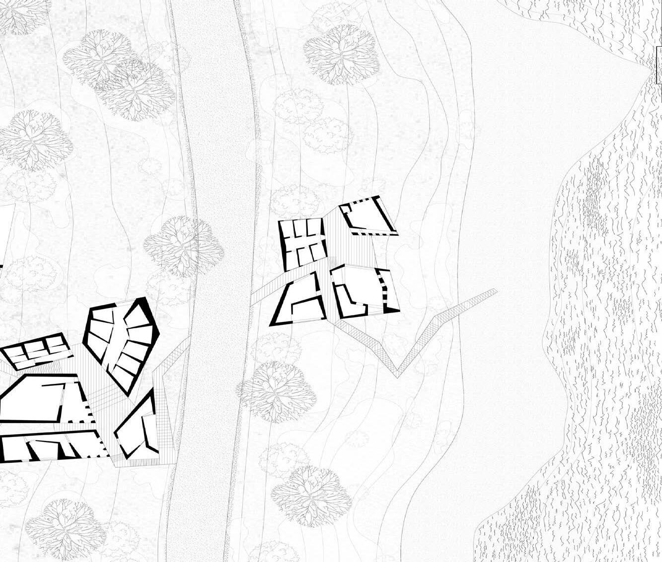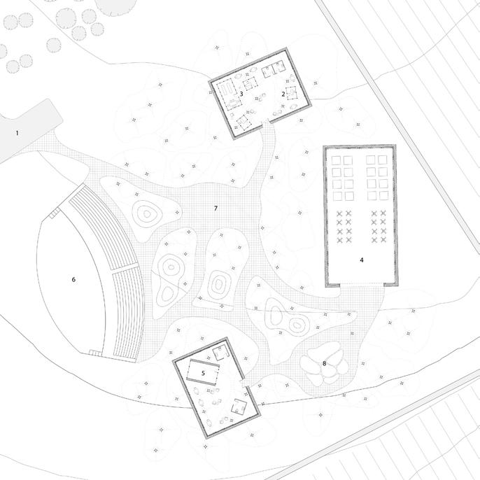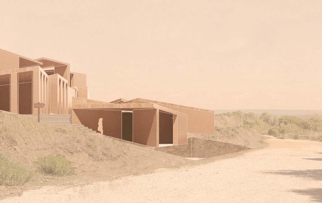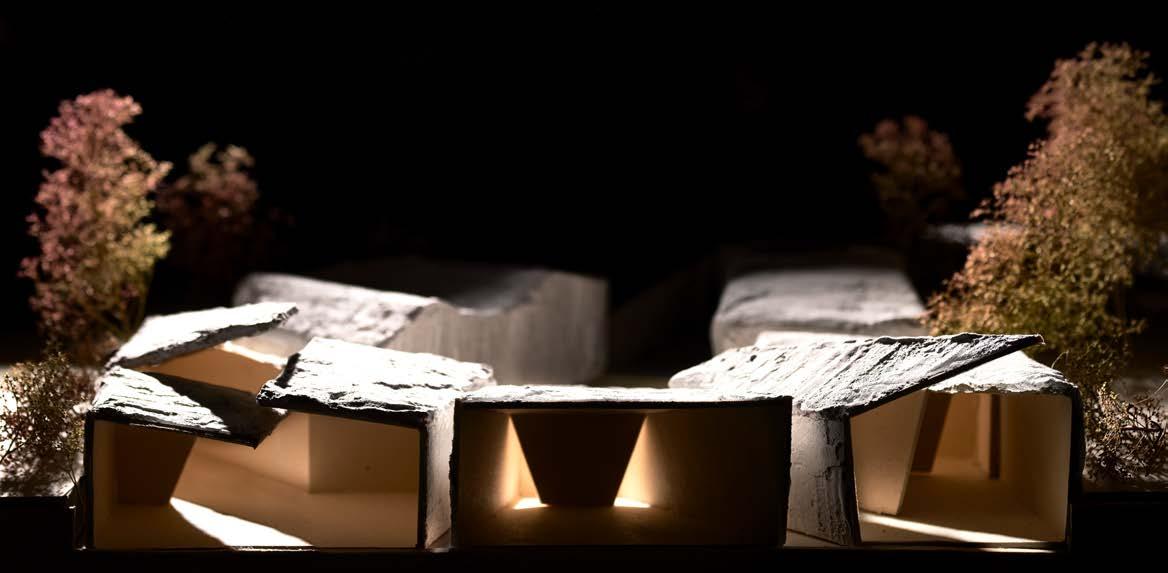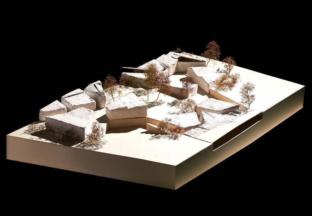 The masterplan of the project is ordered by a system for collecting light and framing interesting views of the site and the buildings themselves. Walls are treated as apertures and are organized by varying thicknesses that reinforce the hierarchy of preferred faces for natural light and view finding. The volumes are controlled by a language of folding, which generates the duality between figural planes and boulder forms. The entire campus becomes a material landscape that continuously repositions itself from backdrop, to stage, to frame, acting as a dynamic set for experimentation with filming.