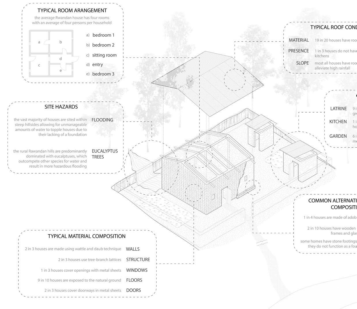 Through analysis of a 340-household comprehensive survey, the research project is to represent the accurate and complex conditions of the typical rural Rwandan house and its relationship to site, economy, and regional politics. In a post-genocicde Rwanda, the state is ambitiously reforming the social, economic, and cultural landscape of the country, imposing various policies on architecture and development. State policies have predominantly focused on the most urban regions of the country, and have left behind or contradicted the economic conditions of rural citizens. The analysis reveals the significant need for repair in rural houses as well as thoughtful intervention that improves access to public infrastructure, health, and safety. The diagrams and eventual publication are intentionally legible to audiences ranging from governmental officials, donor bases, designers, and the rural citizens themselves.