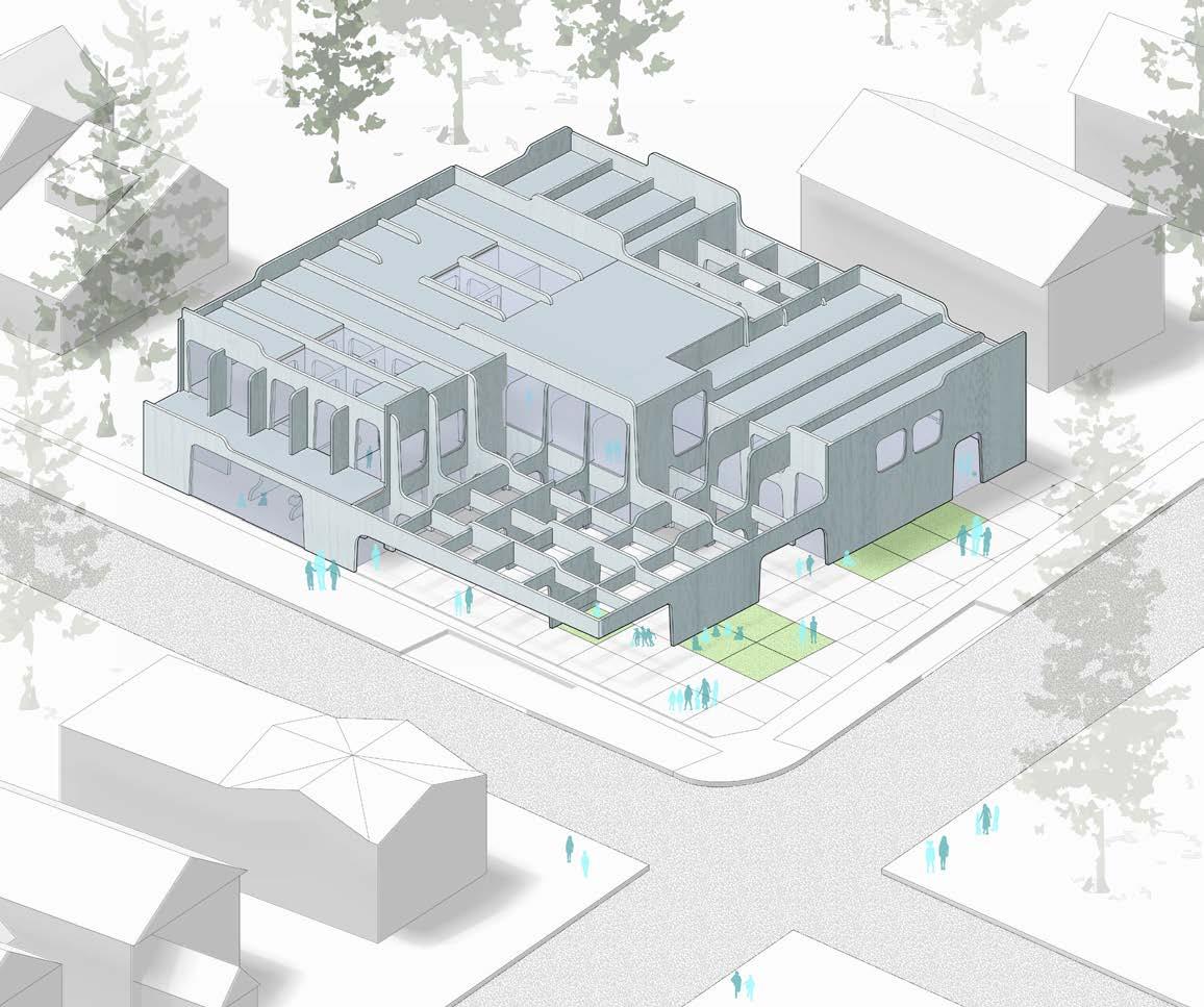 Sited central to several southside Syracuse schools, the interconnectivity community youth center provides space for academic, recreational, and artistic programs significantly lacking in the neighborhood. Existing programs are above all in need of a setting, so the center strategically provides a flexibility and interlocking between programmatic themes to support community ownership and freedom of use. Programmatic developments of the center support these programs in need while also providing more public green space and platforms for activism.