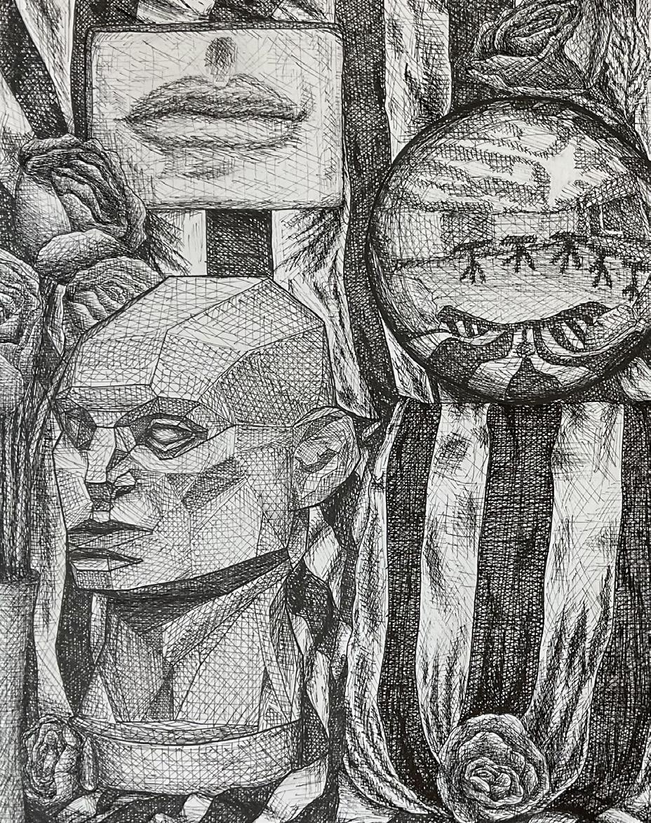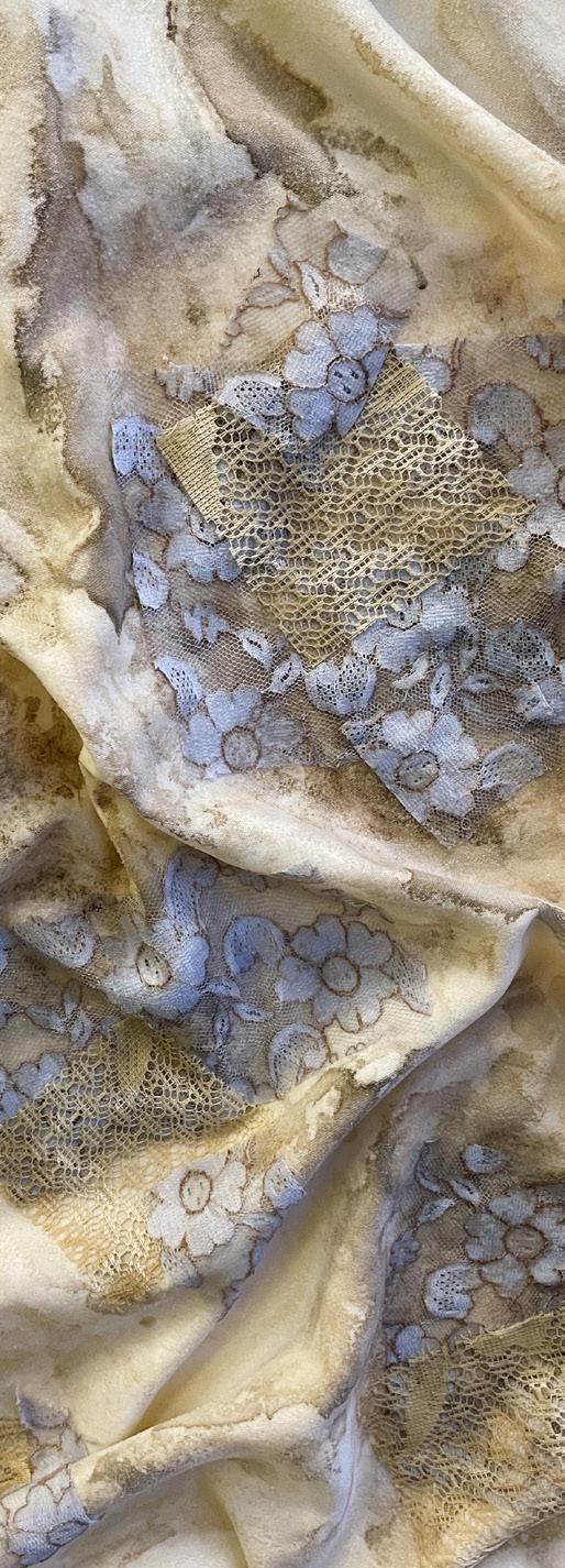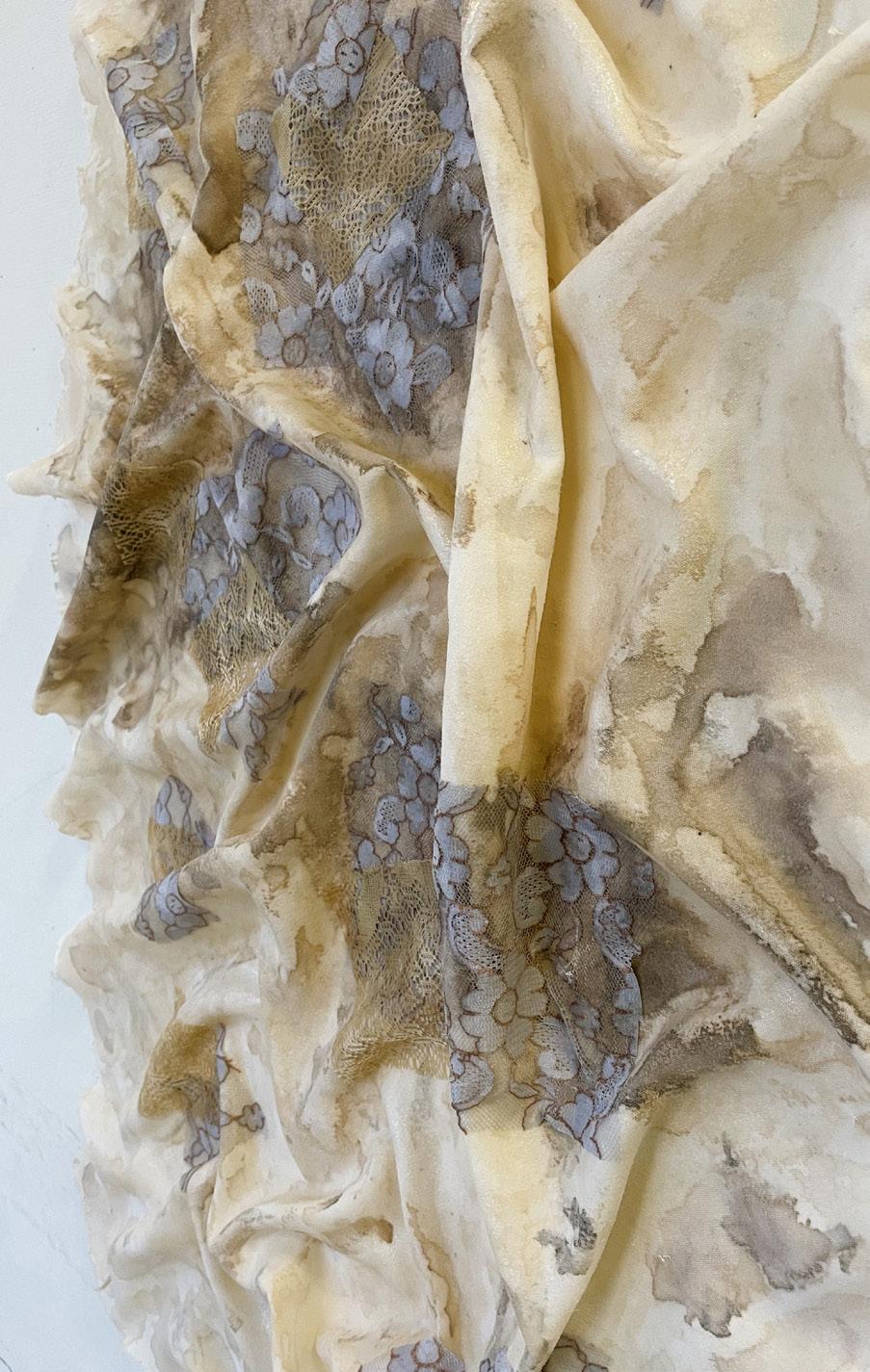 Folds, wrinkles, and layers dirtied in washes of browns, yellows, and blacks. Patches of lace in brown and blue florals attempt to mend the leaks causing the stains across the surface. Shining reflections off the edges made to look wet like water leaks. Rough and inconsistent to the touch, feeling the patches and layers of glue dried into different ridges and folds across the surface. Muddied and stained, patched and mended, this detail is an immersive step into how the detail of the Farm House Museum effected the visible parts of the wall. The visible scars of the damage are preserved as evidence of the failed detail and evidence of the way we, as humans, can learn from our mistakes. This detail is the story of the beauty in failure and the ability to try again.