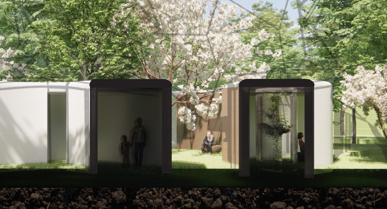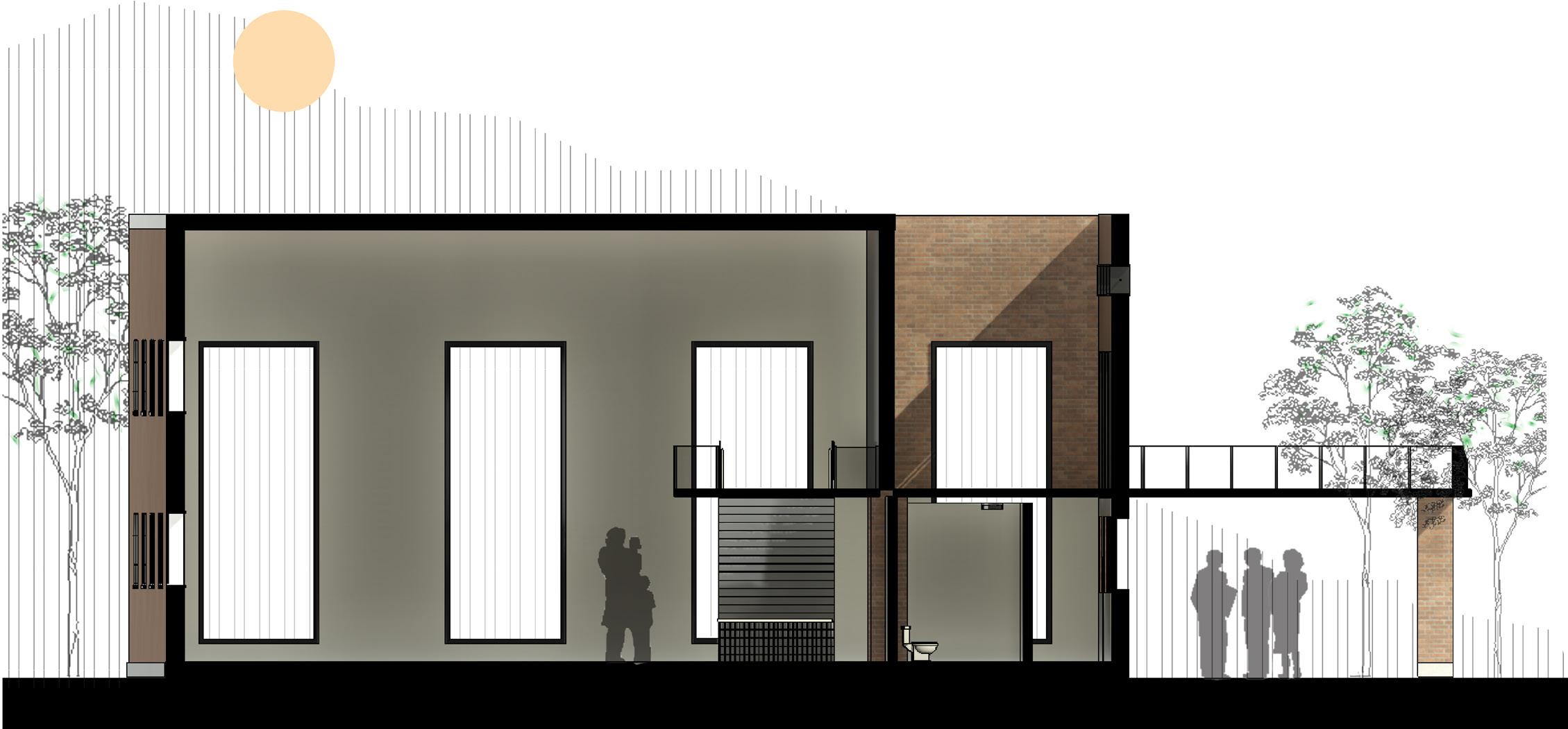 The ritual of remembering is a universal experience, that is experienced differently for different people and different times. Choosing a neutral space in Ames, like Brookside Park, to create this space invites the many people in Ames, wherever they may come from and whatever their beliefs are. The scale of passage within the three forms perpetuates the program of that particular space. Within these forms, there are series of narrow windows and solid walls, large windows, solid wall, and layered wooden screens on the exterior, creating different auras within these spaces by using light and lack of light. Movable seating and unenclosed thresholds are additionally functioning as opportunities for the space to respond to the user and their needs in relation to the ritual. The adaptive program of this space is intrinsic to the ritual in its span of experiences across the population.