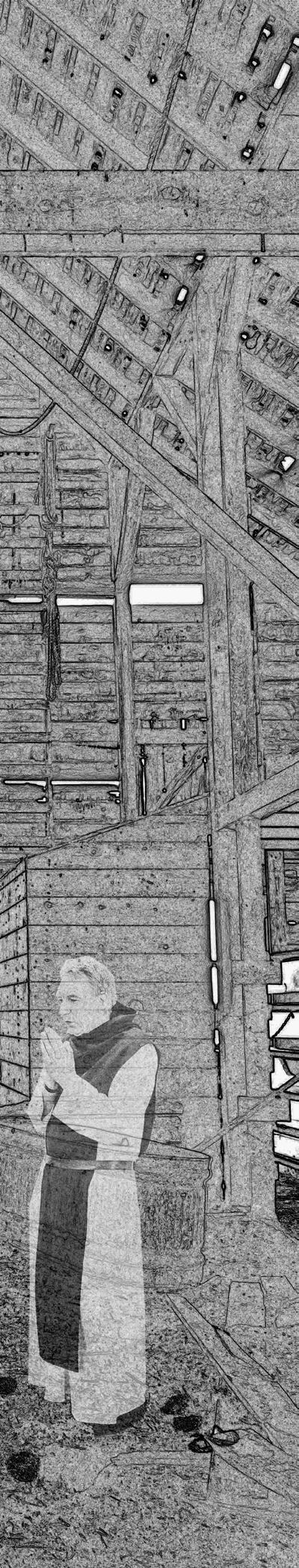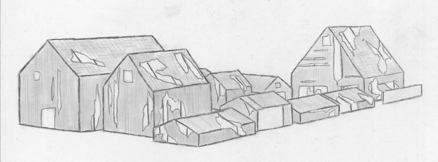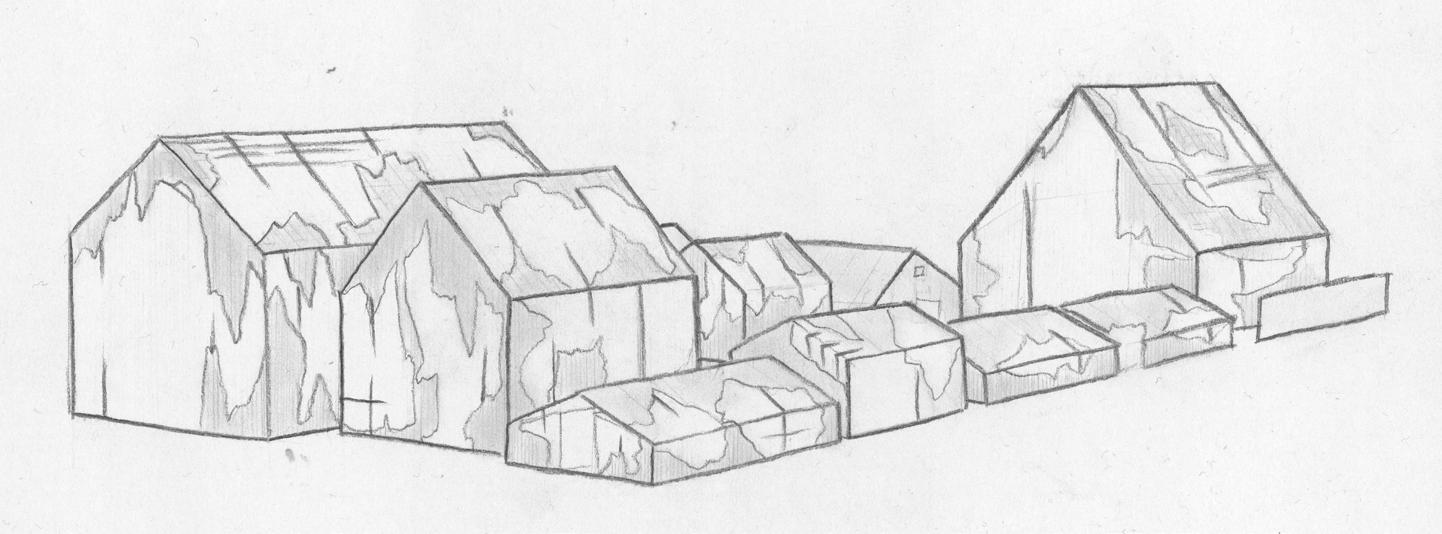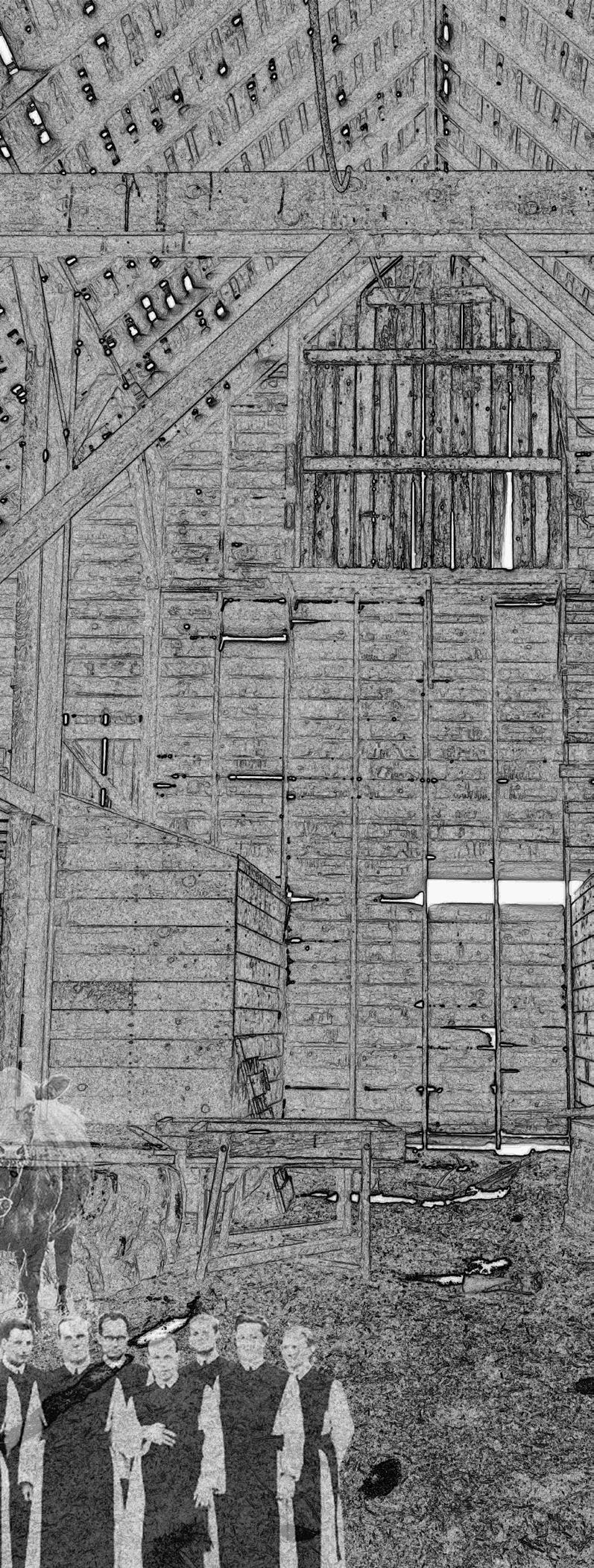 The first church service in Sheldahl was held in a haybarn in September of 1855. The historic importance of agricultural buildings is deeply embedded in Iowa both religiously and industrially. The typology of the agricultural buildings is largely form based on needs of the building and the farms. As the industry changes, it leaves a number of these buildings obsolete, artifacts of the evolution of farming and Iowa. Utilizing these out of use buildings as an exoskeleton to new build as a visualization of time and life as they decay. These buildings embark on a pilgrimage of their own moving from their original place to the new monastic complex, and then continue to decay as a sort of “pilgrimage in place.” The pilgrimage is also for the people, as the approach is a wandering road with intended parking approximately 500 feet away from the complex itself. The intentional journey to place demonstrates ideals in line with the practice of pilgrimage in the Catholic faith. The buildings moved to the place reflect the needs of the new spaces/uses in their similarity yet contrast to the former use. The monastic dorms were formerly hog nurseries, low, tight buildings, which now serve as simple bedrooms with simple furnishings. The chapel space utilizes light, wind, and weather to reinforce the aura of a mass and the eventual decay will create an open air space, connecting the worship back to nature. The building orientation on site, with lower buildings on the south and taller on the north, allows for sunlight to be let into the courtyard and wind to be buffered around. The approach and walkway within the complex is intentionally meandering to reinforce the idea of discovery and pilgrimage in finding the chapel and center spaces.