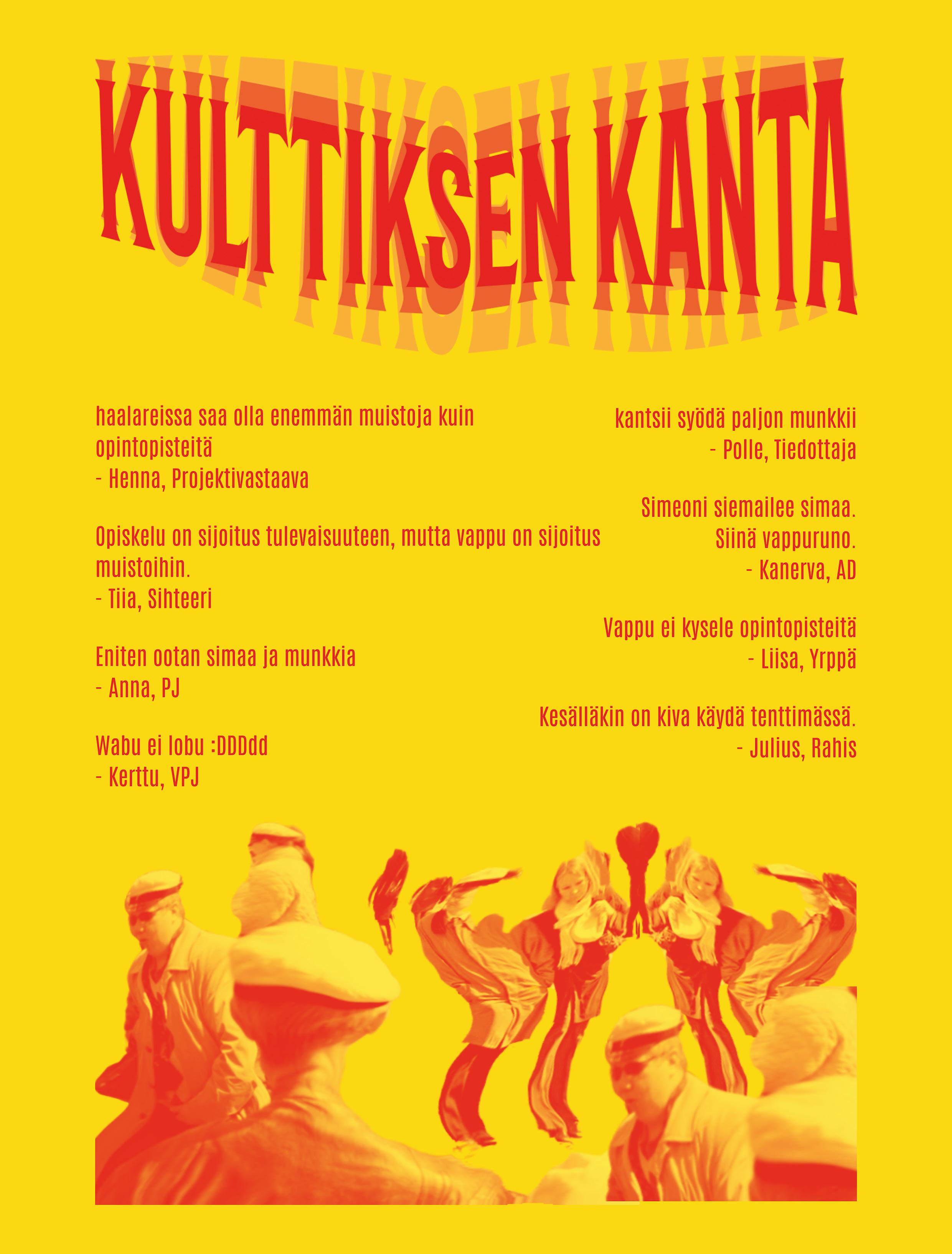 Tämän lehden ilmestyessä vappu on kuitenkin jo (viimein tai valitettavasti) aika lailla ohi, ja itse kunkin on aika jatkaa elämää taas kesän verran eteenpäin ennen seuraavaa opiskelurupeamaa. Jos vapun jälkeinen krapula ja tyhjyyden tunne vielä kuitenkin jäytää, etkä ehkä ole ihan vielä henkisesti valmis töihin seuraavalla viikolla, niin ei hätää, sillä tästä KYlisteestä pääset vielä palaamaan vapun tunnelmaan.