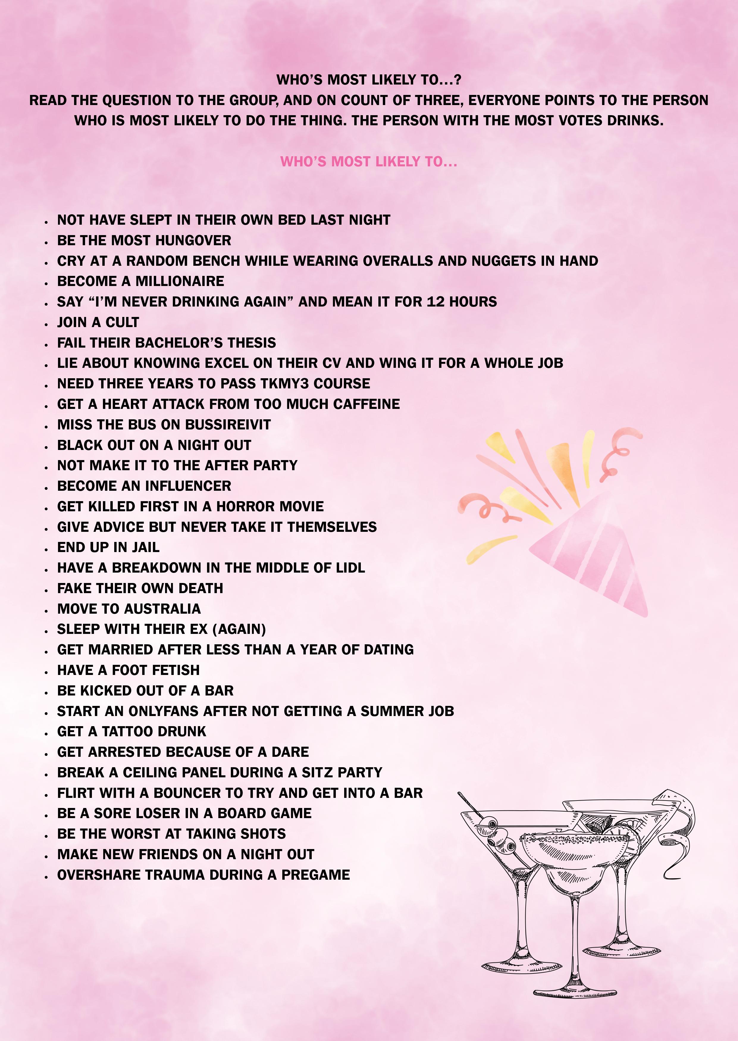 Olet aina jatkoilla pilkkuun asti ja koet olevasi huoneen hauskin tyyppi. Jotkut ovat ehkä samaa mieltä.