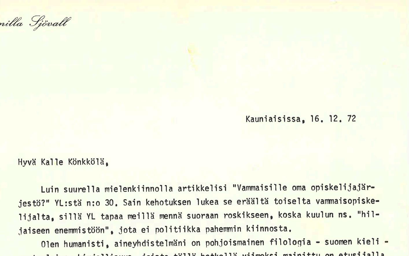 Luin suurella mielenkiinnolla artikkelisi ”Vammaisille oma opiskelijajärjestö?” YL:stä n:o 30. Sain kehotuksen lukea se eräältä toiselta vammaisopiskelijalta, sillä YL tapaa meillä mennä suoraan roskikseen, koska kuulun ns. ”hiljaiseen enemmistöön”, jota ei politiikka pahemmin kiinnosta.