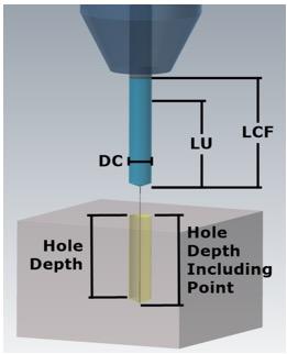 For dimensional and finish quality, a low TIR of the tool-holder assembly in the machine is critical: less than 0.1% drill diameter is preferred. Spot drilling is not necessary in most situations if the drilling surface is machined flat ; spot drill point angle should be greater than drill point angle. Liquid coolant (internal or external) such as oil based or synthetic is highly recommended for all drilling applications. For proper cooling, lubrication and chip evacuation, ensure the coolant is supplied throughout the entire depth of the hole. When liquid coolant cannot be applied for applications such as plastics or composites, clear the swarf with air or vacuum. Depending on material machinability, a peck cycle may be necessary for external coolant drills beyond 2x or 3x depths.