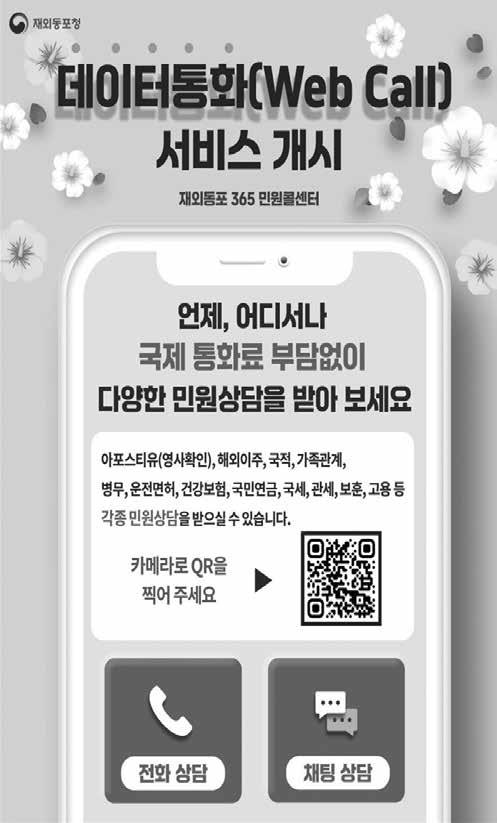 재외동포청 재외동포서비스지원센터는 재외동포 가 국제통화료 부담없이 민원상담서비스를 제공 받을 수 있는 ‘재외동포 365 민원콜센터 데이터 통화(웹콜) 서비스’를 4.30(화) 한국시간 9시부터 개시합니다.