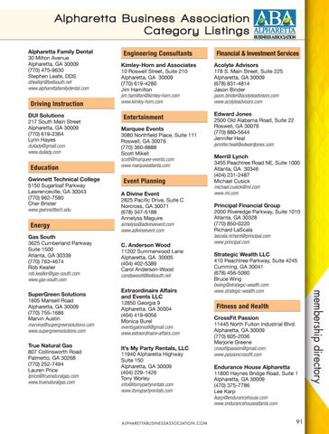 A l pharetta Bus i n e ss A sso c i a ti o n C a te g o r y Li sti n g s Alpharetta Family Dental 30 Milton Avenue Alpharetta, GA 30009 (770) 475-9630 Stephen Leafe, DDS drleafejr@bellsouth.net www.alpharettafamilydental.com