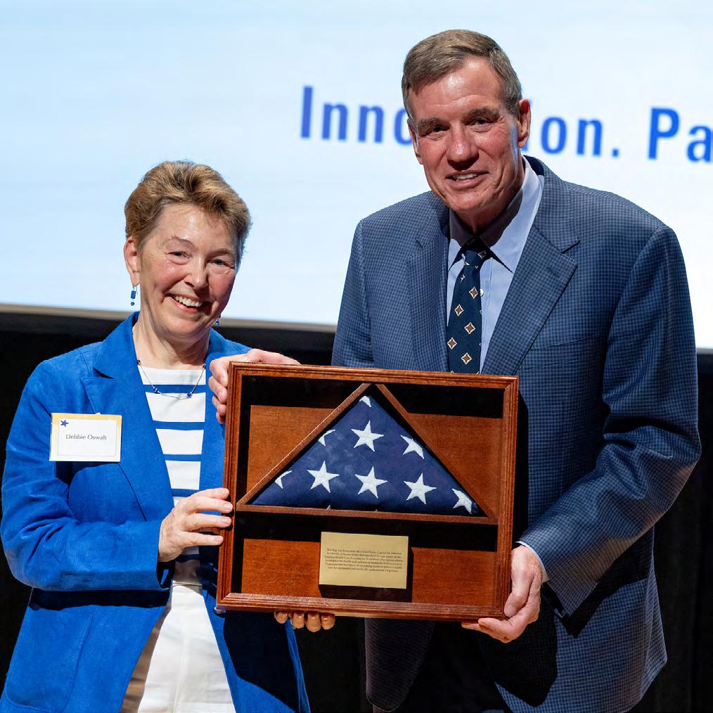 Photo of Debbie and Senator Warner: The Senator congratulates Debbie on her 33 years of dedicated service to the Foundation.