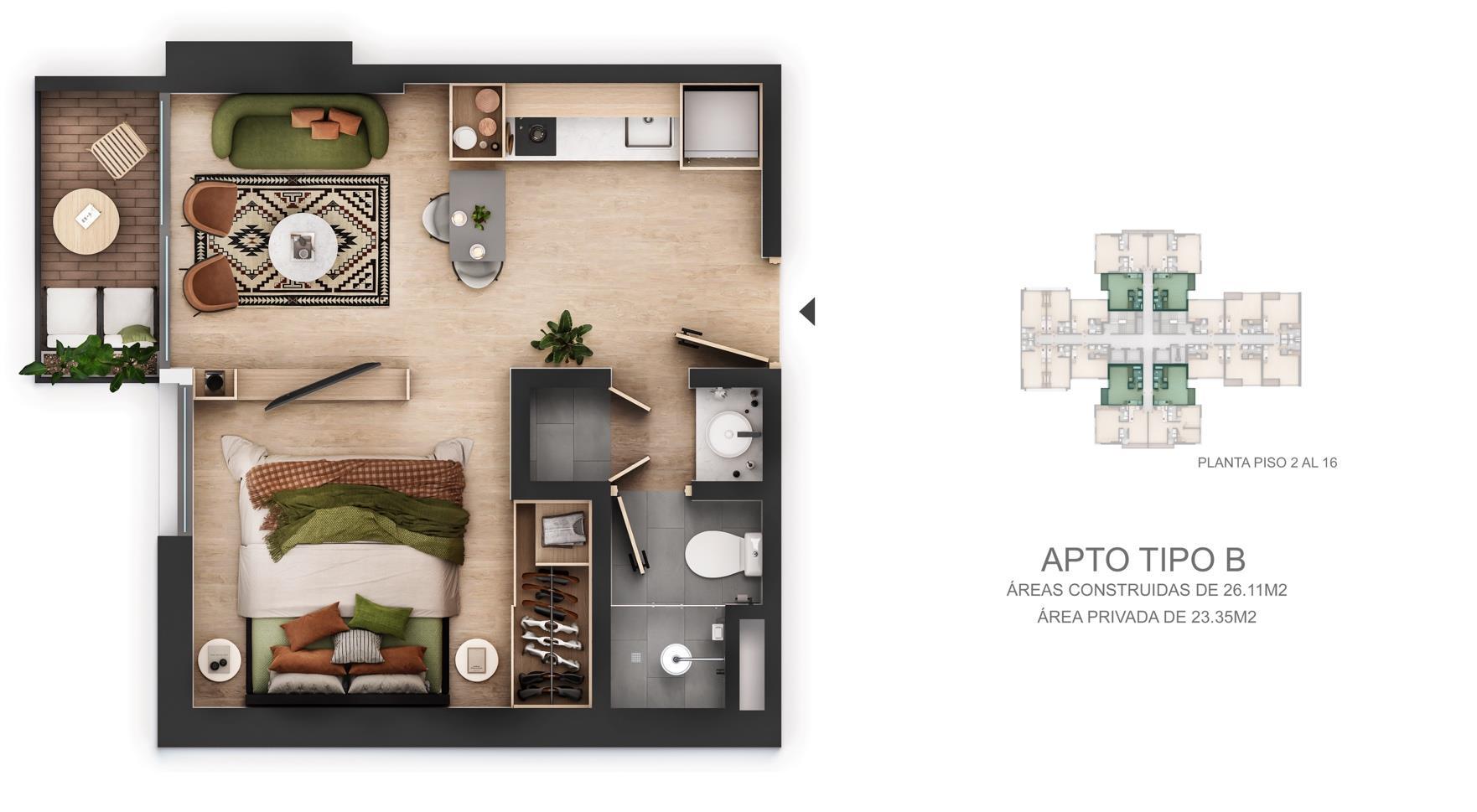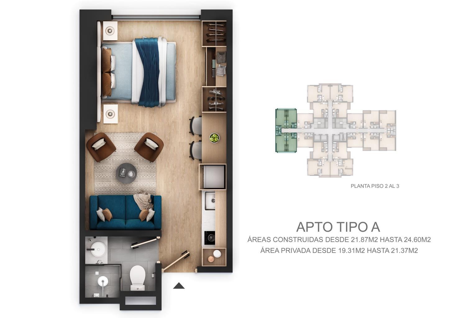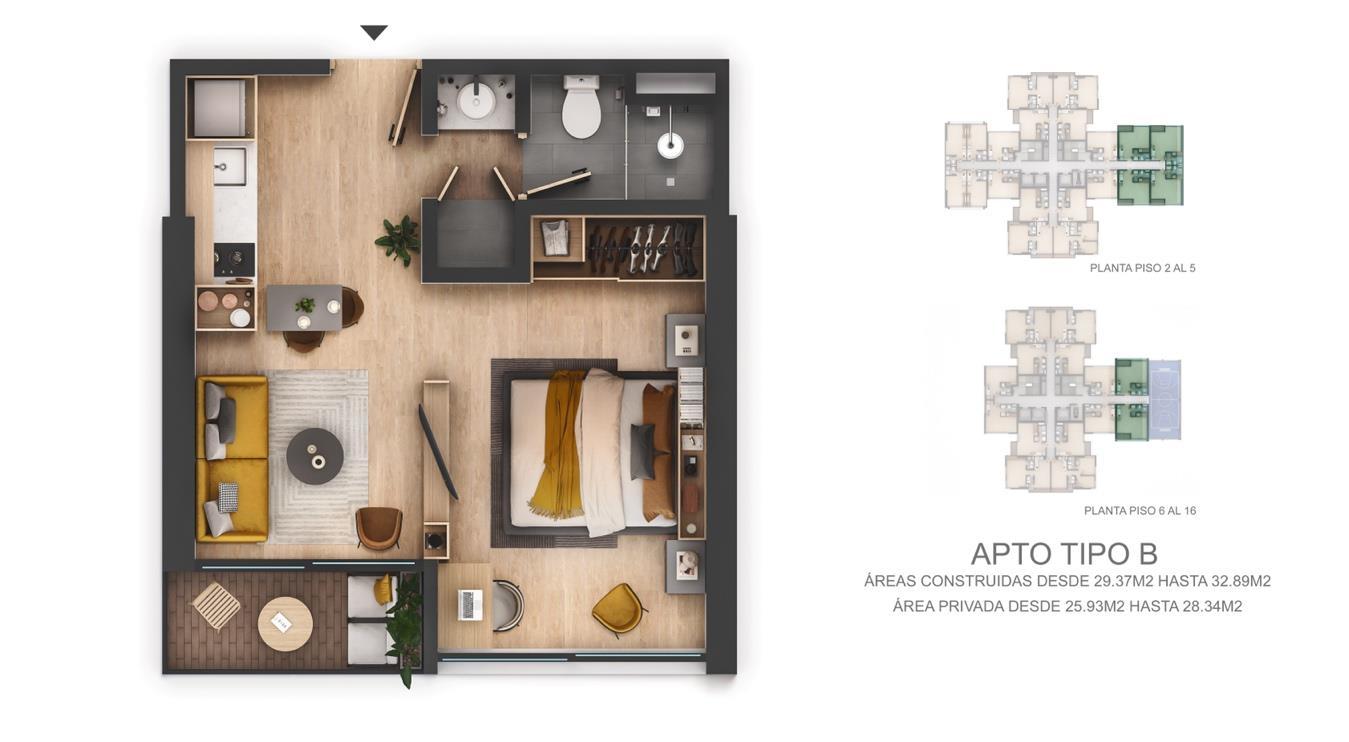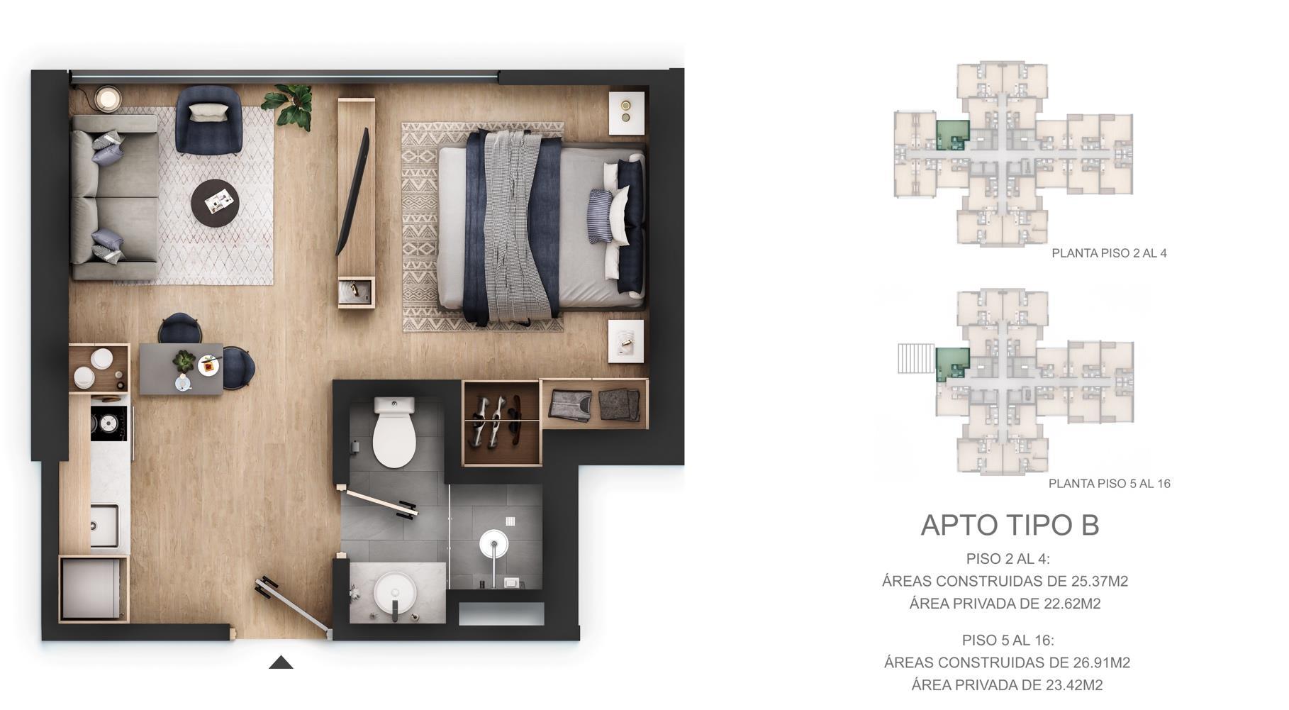 Las áreas aquí descritas pueden ser modificadas por los entes de control al momento de la expedición de la licencia de construcción Las imágenes son representaciones artísticas del dibujo, por lo tanto, los detalles del diseño, colores y especificaciones de materiales están sujetos a modificaciones durante el proceso de construcción. Las áreas son aproximadas. El mobiliario representado hace parte de los elementos decorativos de la representación gráfica y no comprometen al constructor Planos sujetos a modificación porcoordinación técnica y estructural