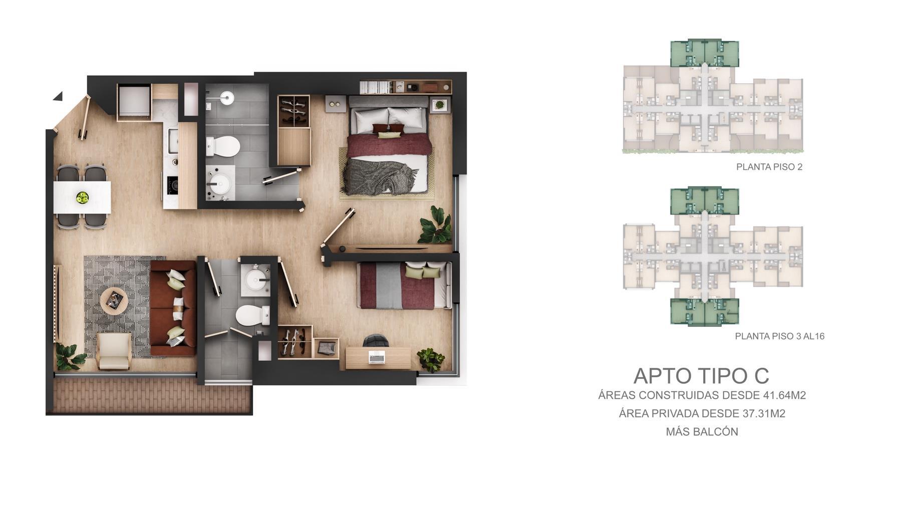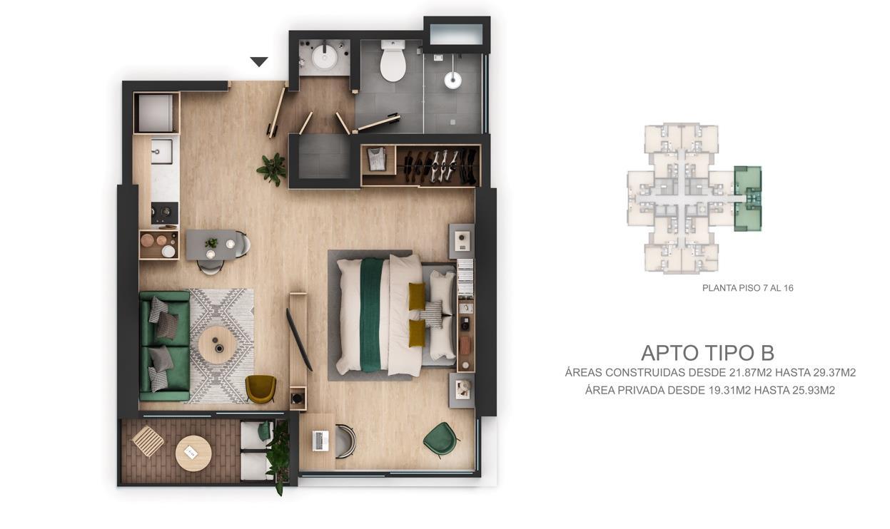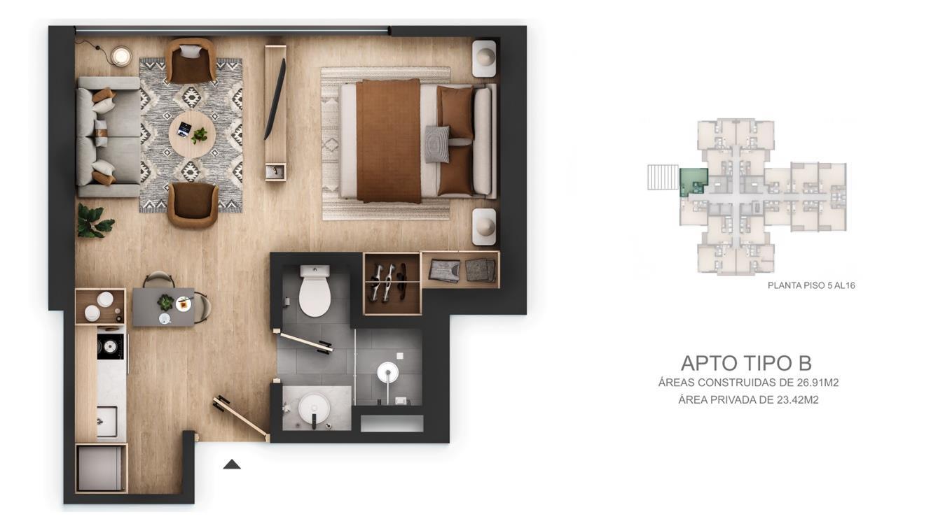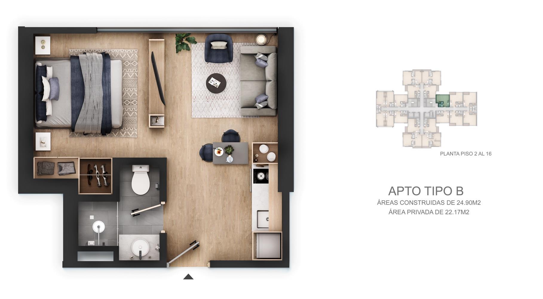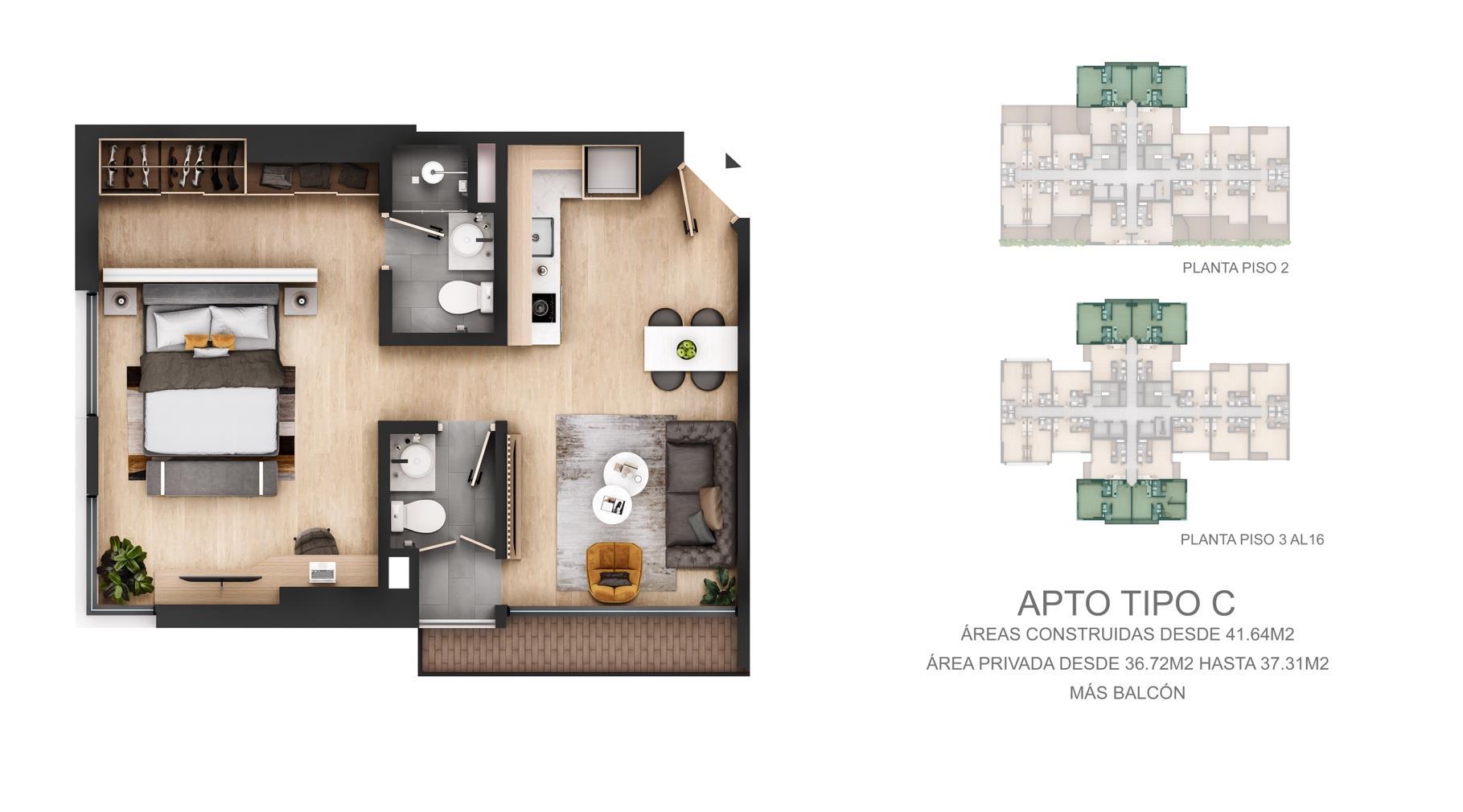Las áreas aquí descritas pueden ser modificadas por los entes de control al momento de la expedición de la licencia de construcción Las imágenes son representaciones artísticas del dibujo, por lo tanto, los detalles del diseño, colores y especificaciones de materiales están sujetos a modificaciones durante el proceso de construcción. Las áreas son aproximadas. El mobiliario representado hace parte de los elementos decorativos de la representación gráfica y no comprometen al constructor Planos sujetos a modificación porcoordinación técnica y estructural