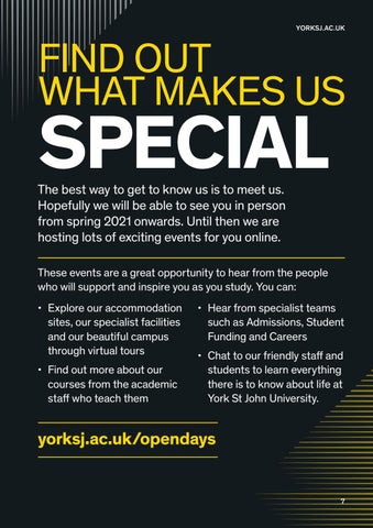 • Hear from specialist teams such as Admissions, Student Funding and Careers • Chat to our friendly staff and students to learn everything there is to know about life at York St John University.
