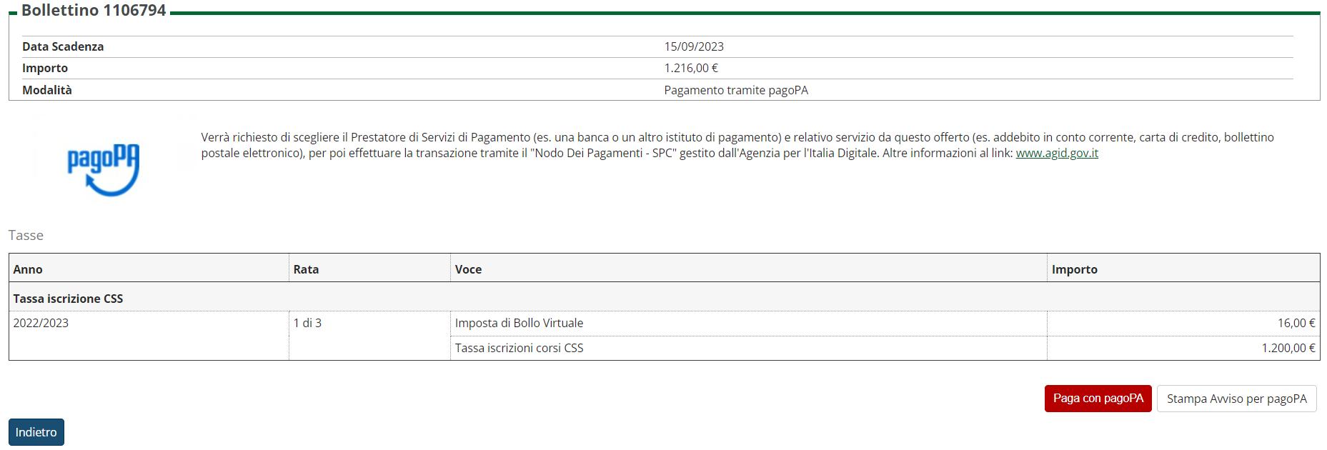 Si può effettuare il pagamento diretto on line cliccando sul pulsante “Paga con pagoPA”, oppure si può stampare un avviso di pagamento pagabile presso gli oltre 400 Prestatori di Servizi di Pagamento (PSP) aderenti a PagoPA cliccando sul pulsante “Stampa Avviso per pagoPA”.