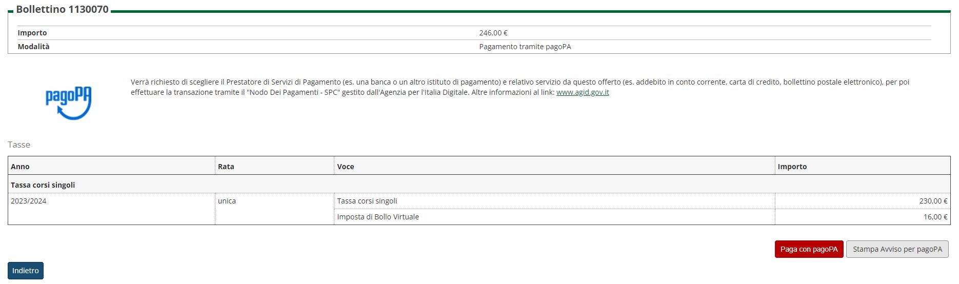 Si può effettuare il pagamento diretto on line cliccando sul pulsante “Paga con pagoPA”, oppure si può stampare un avviso di pagamento pagabile presso gli oltre 400 Prestatori di Servizi di Pagamento (PSP) aderenti a PagoPA cliccando sul pulsante “Stampa Avviso per pagoPA”.