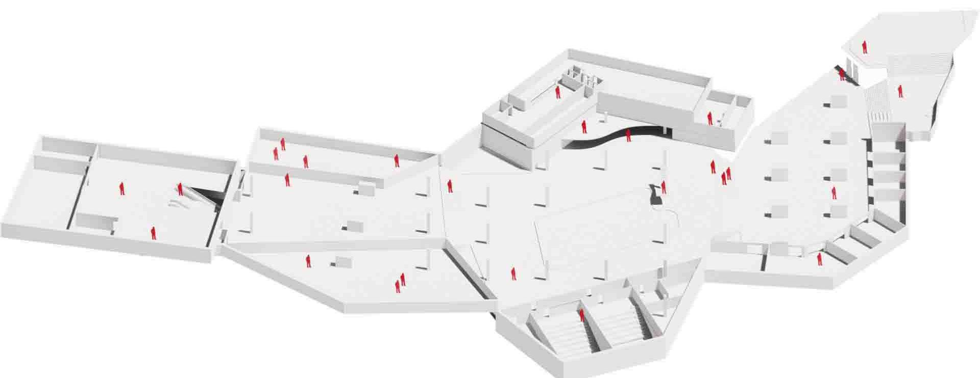 El estudio de la ocupación de las edificaciones existentes en los terrenos de la antigua fábrica antártica se realizó de forma conjunta a través del análisis de los diferentes grados de edificación catalogada y la comprensión de la relación entre los programas catalogados. Buscando crear una conexión y reactivar los bordes del terreno, se propusieron nuevos accesos que conectan directamente con la ciudad y la estación de trenes de Mooca. Las primeras plantas, aunque sean de distinto nivel, se comunican mediante una pasarela elevada,