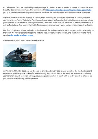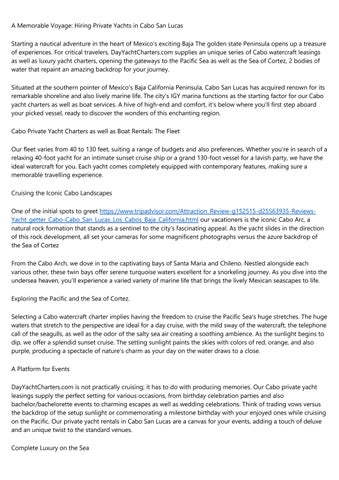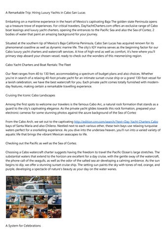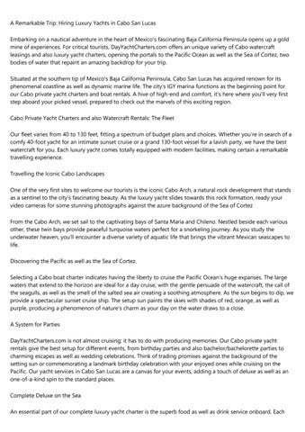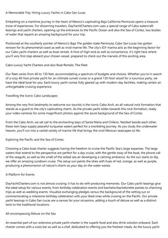 DayYachtCharters.com uses a luxurious as well as unforgettable journey on the waters of Cabo San Lucas. From our diverse fleet of private yachts, accommodating different budgets and also choices, you can start a trip that takes you past Cabo's famous spots, including the well-known Cabo Arc, as well as right into the charming bays of Santa Maria and also Chileno for snorkeling journeys. Our Cabo private yacht services provide the excellent setting for all type of parties, be it birthday celebrations, weddings, or just a romantic getaway. On our complete charters, indulge in fresh prepared dishes by an onboard cook, sip on premium alcoholic drinks, and also appreciate the possibility to witness marine life like dolphins and also whales in their natural habitat. Whether you're seeking a day of leisure, an unique place for your special event, or a chance to check out the appeal of Cabo's seascape, DayYachtCharters.com provides an experience beyond the ordinary.