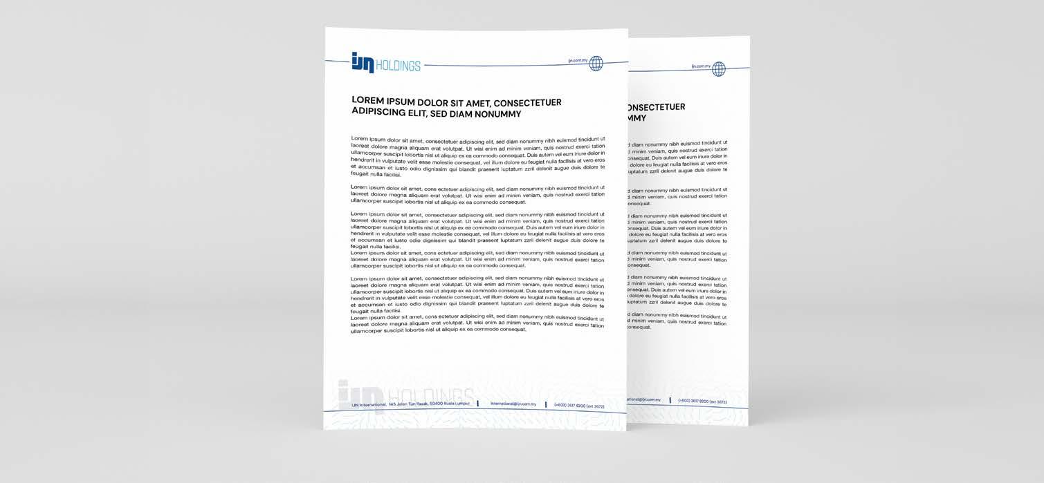 Illustrated is how the letterhead should look like for IJN HOLDINGS corporate brand. At the front cover, ensure that the logo is placed at the top left with IJN contact details at the bottom of the letterhead.