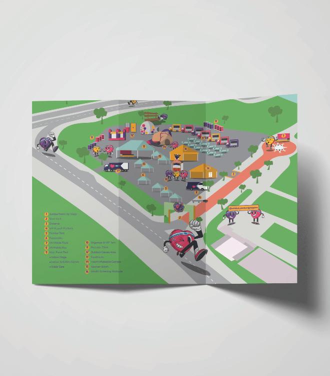 The navigation map for the “IJN Run for Your Heart” event is designed with a vibrant color concept and engaging illustrations to create an inviting and energetic atmosphere.