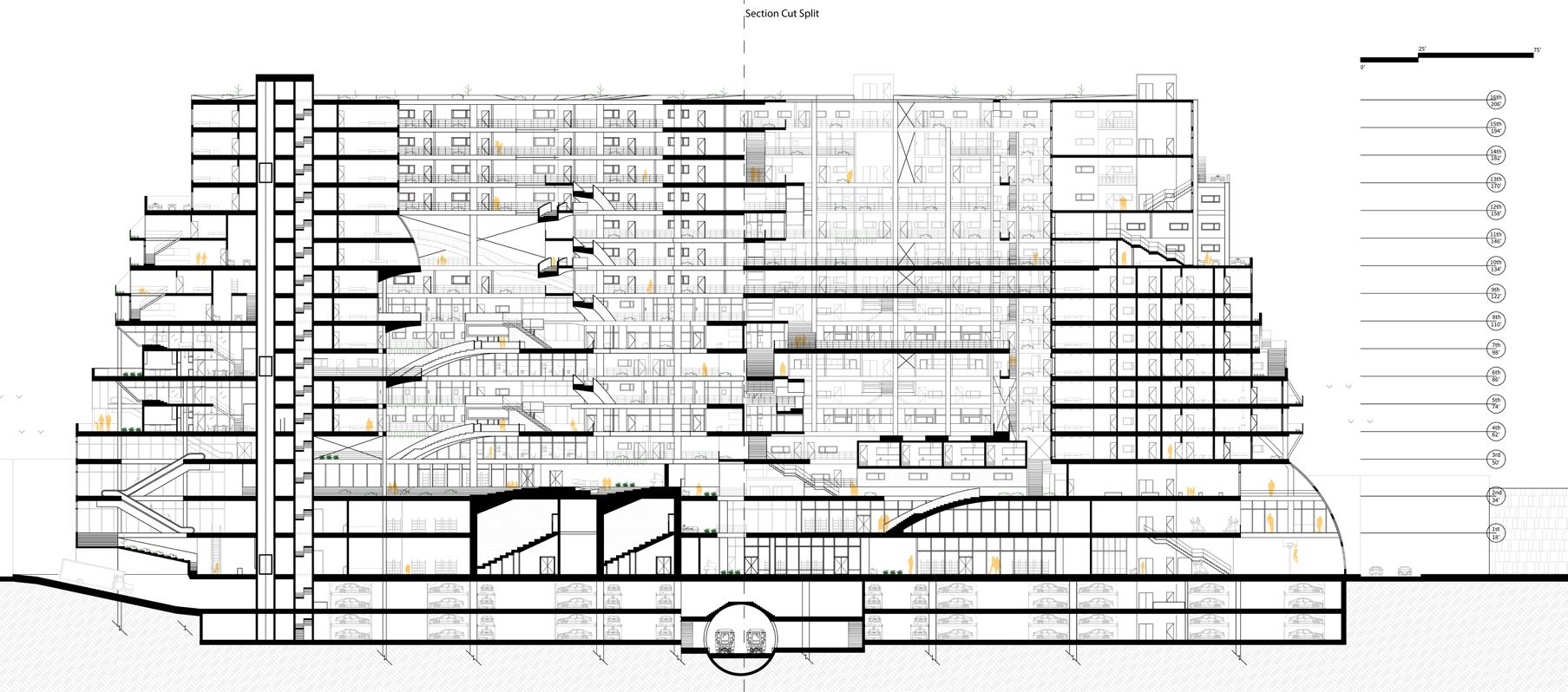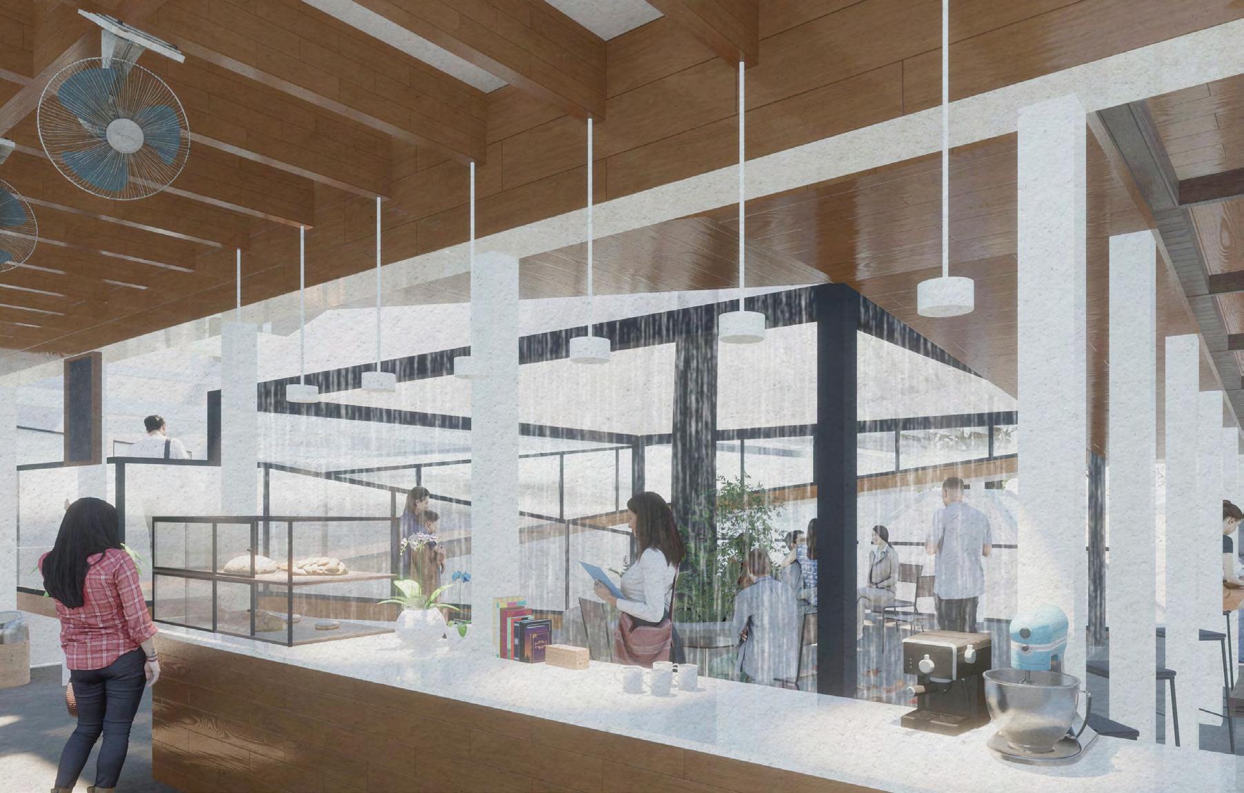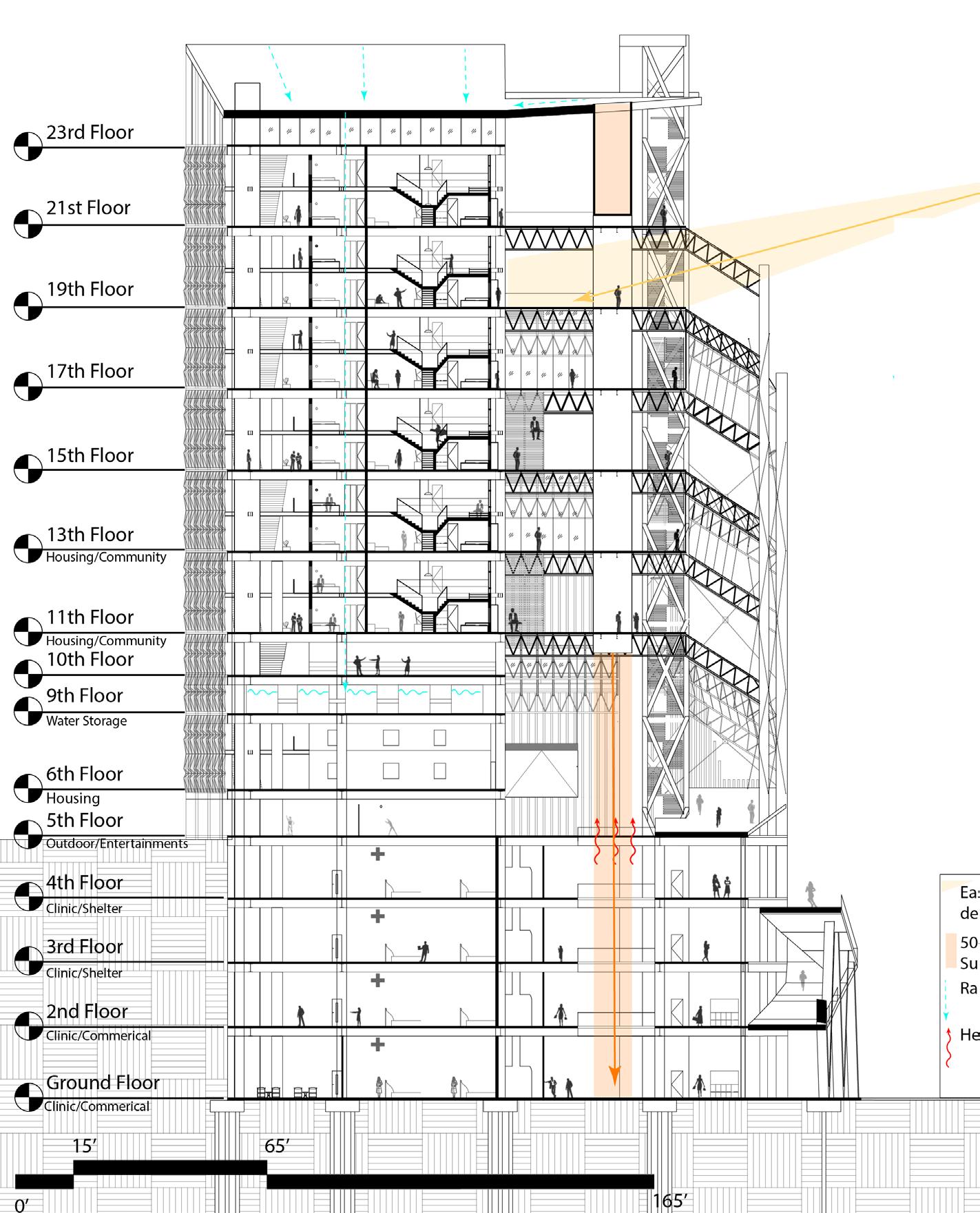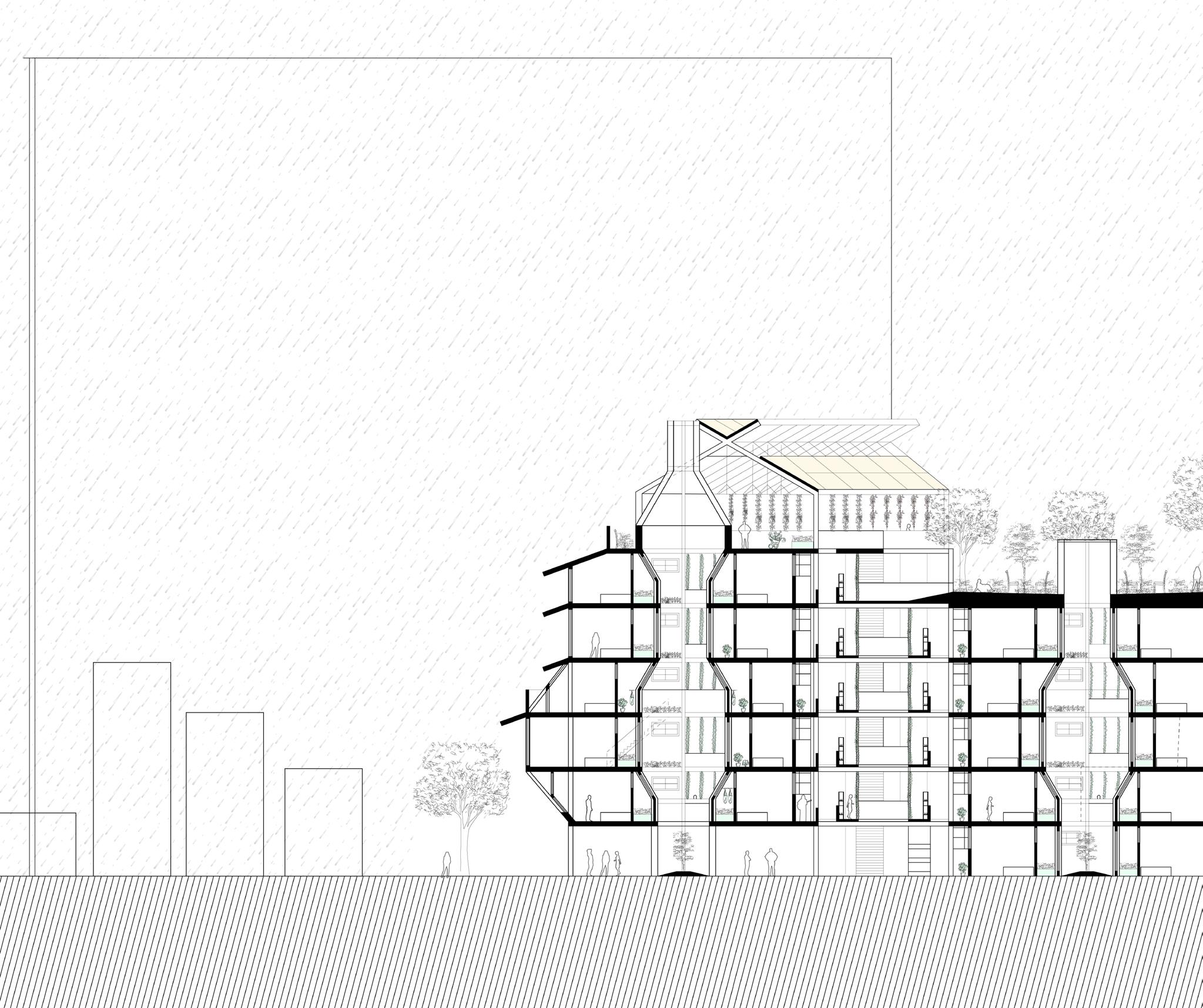 Seek to provide afforable housing with connectivity and public marketplace opportunities for the community. A mix of retail types is included in the design as well as a homeless shelter to help people in need getting back into society.