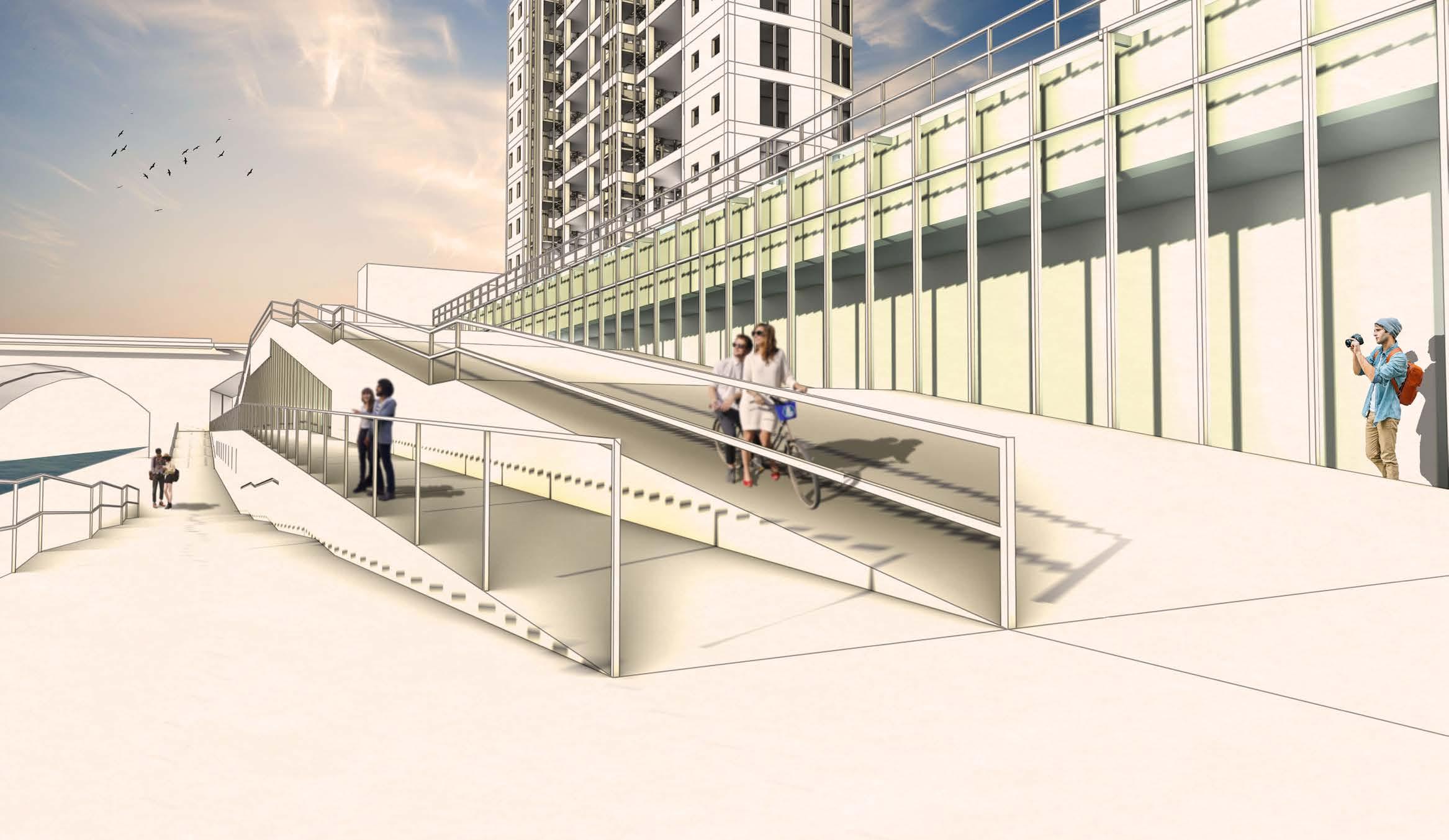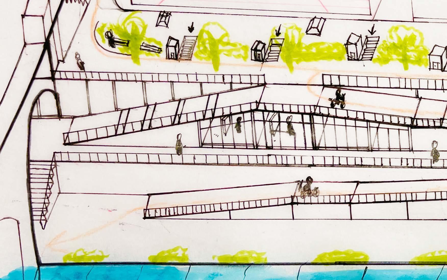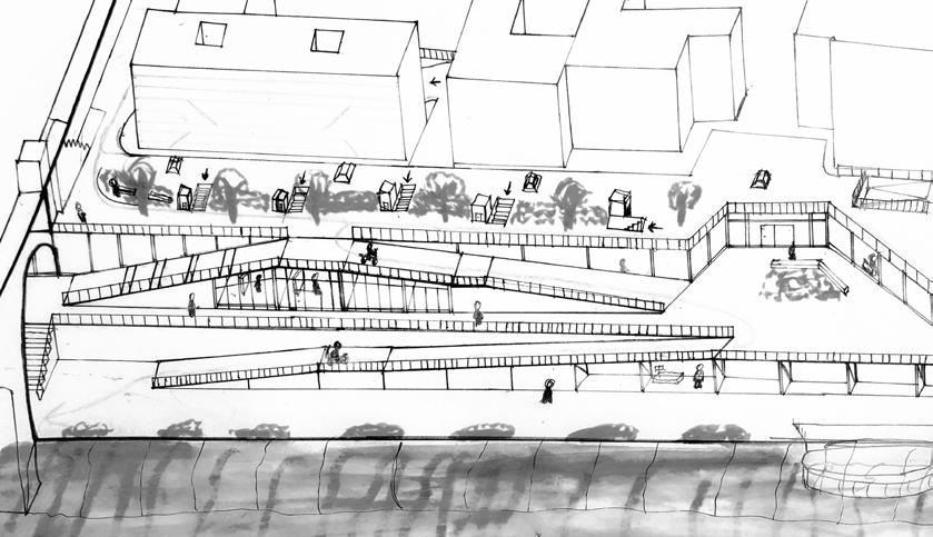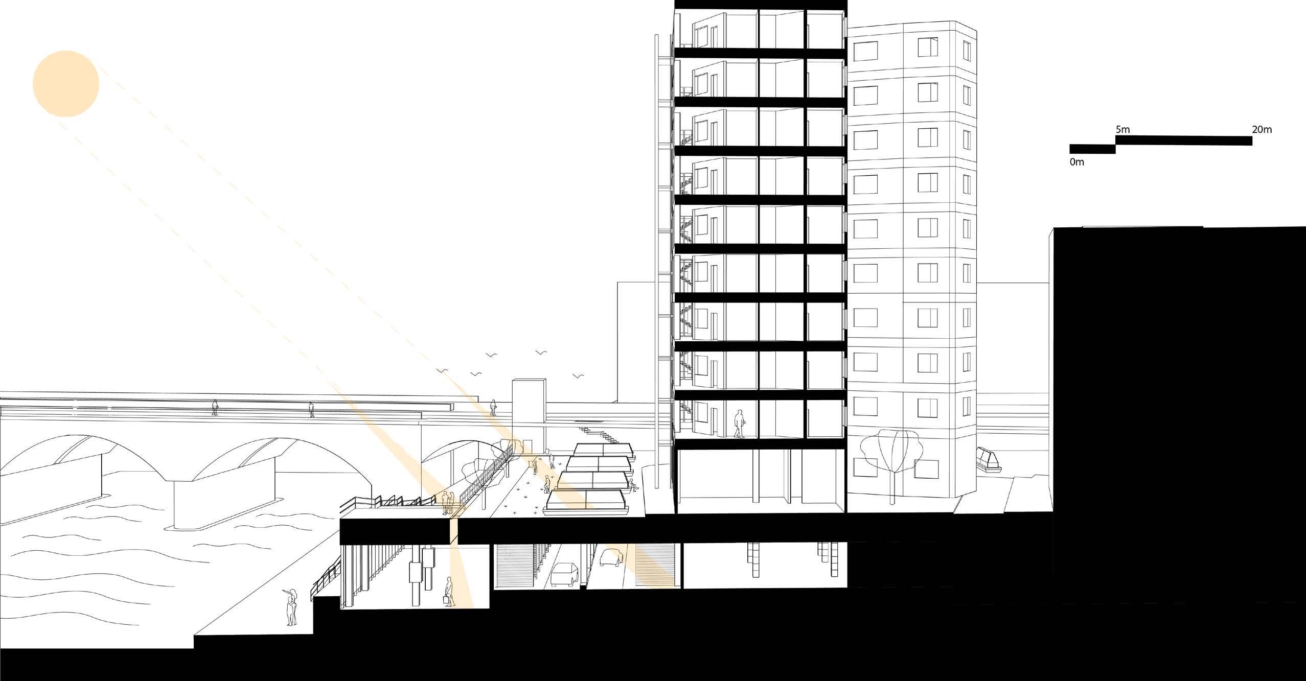 The lack of engagement facing the river front creates a lifeless corner filled with parked cars. Carving an accessible path with an exhibition to showcase community artworks, encourage crowds to lighten the corner. Relocating car accessibilities to under level and give residents additional storage space to lighten up the above area.