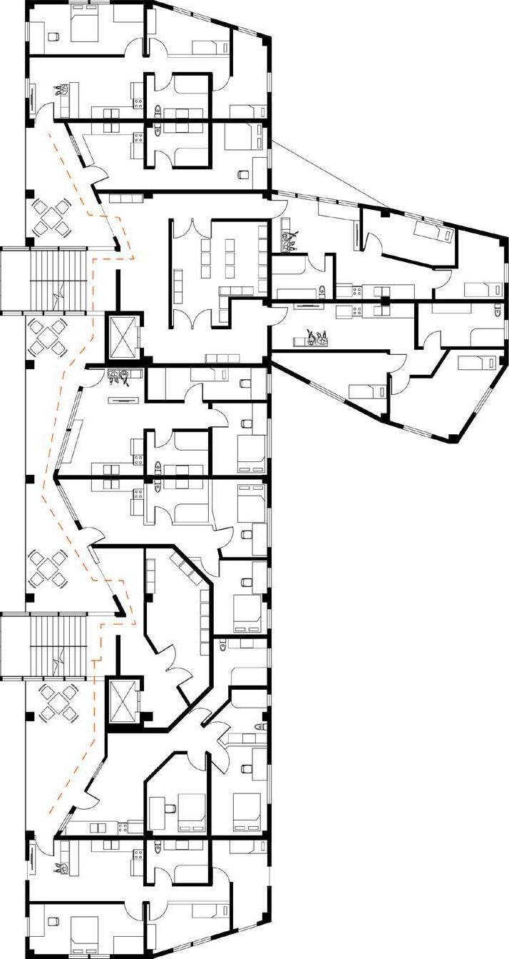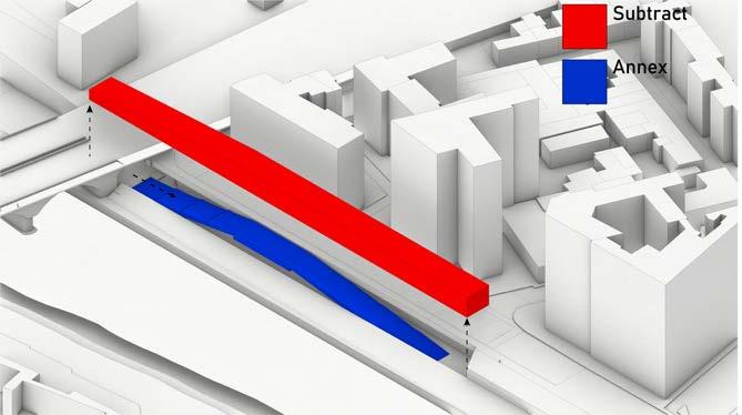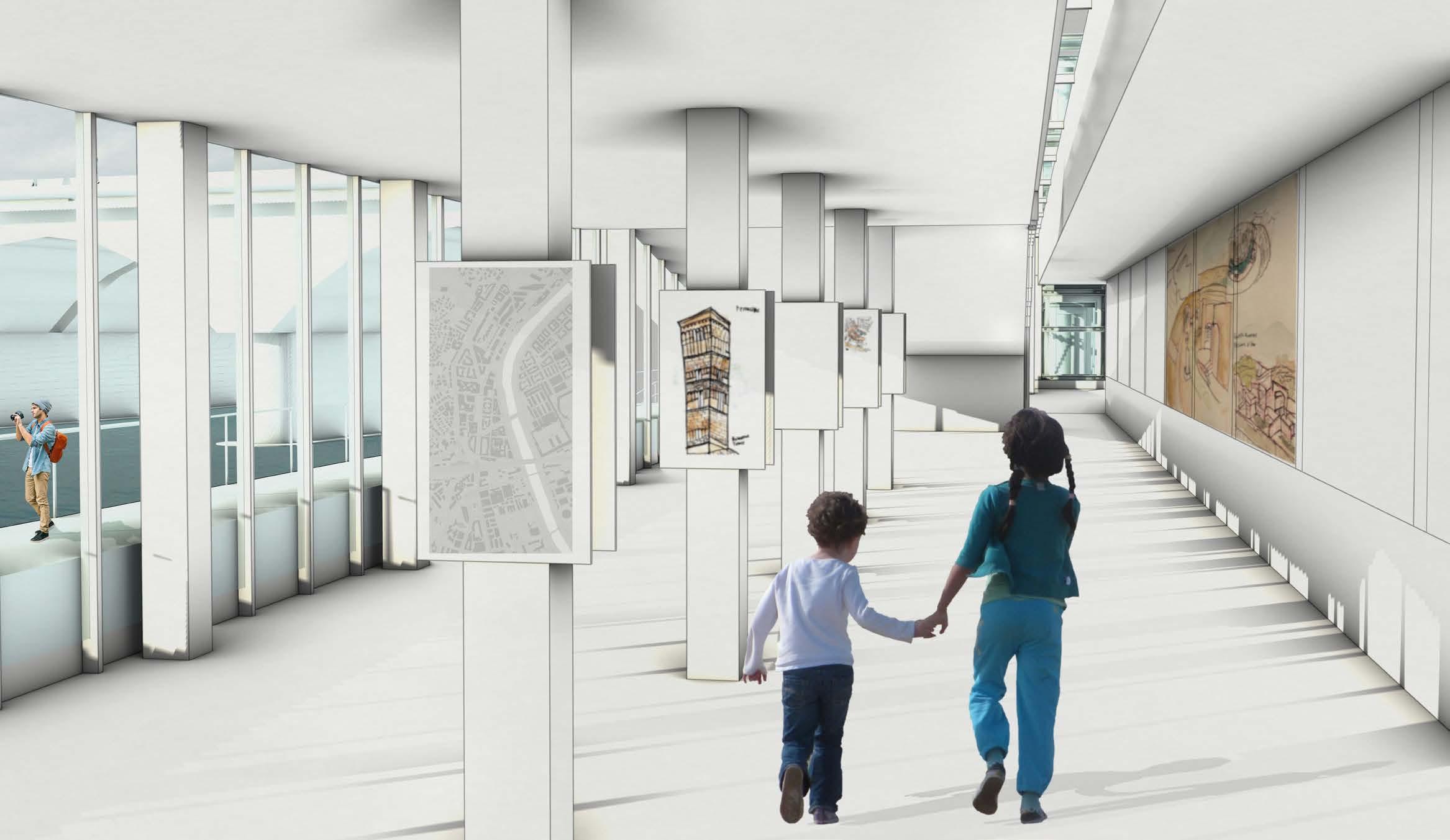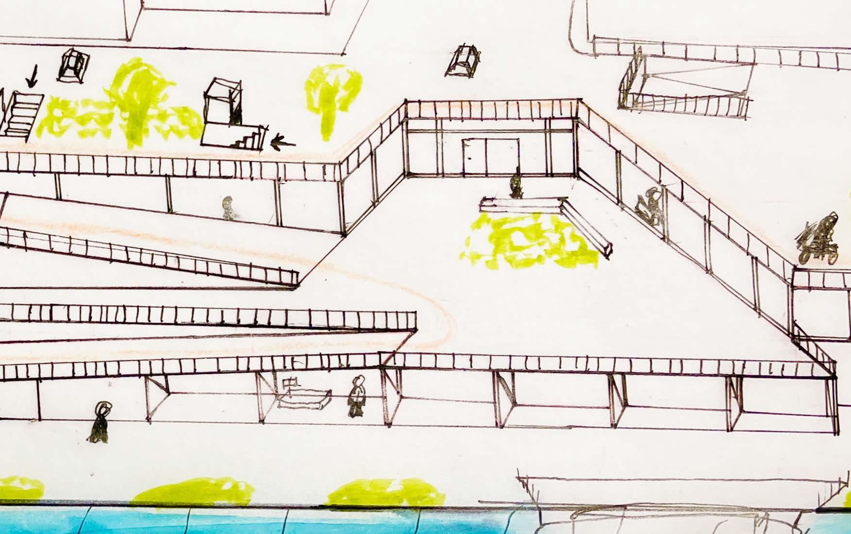 The lack of engagement facing the river front creates a lifeless corner filled with parked cars. Carving an accessible path with an exhibition to showcase community artworks, encourage crowds to lighten the corner. Relocating car accessibilities to under level and give residents additional storage space to lighten up the above area.