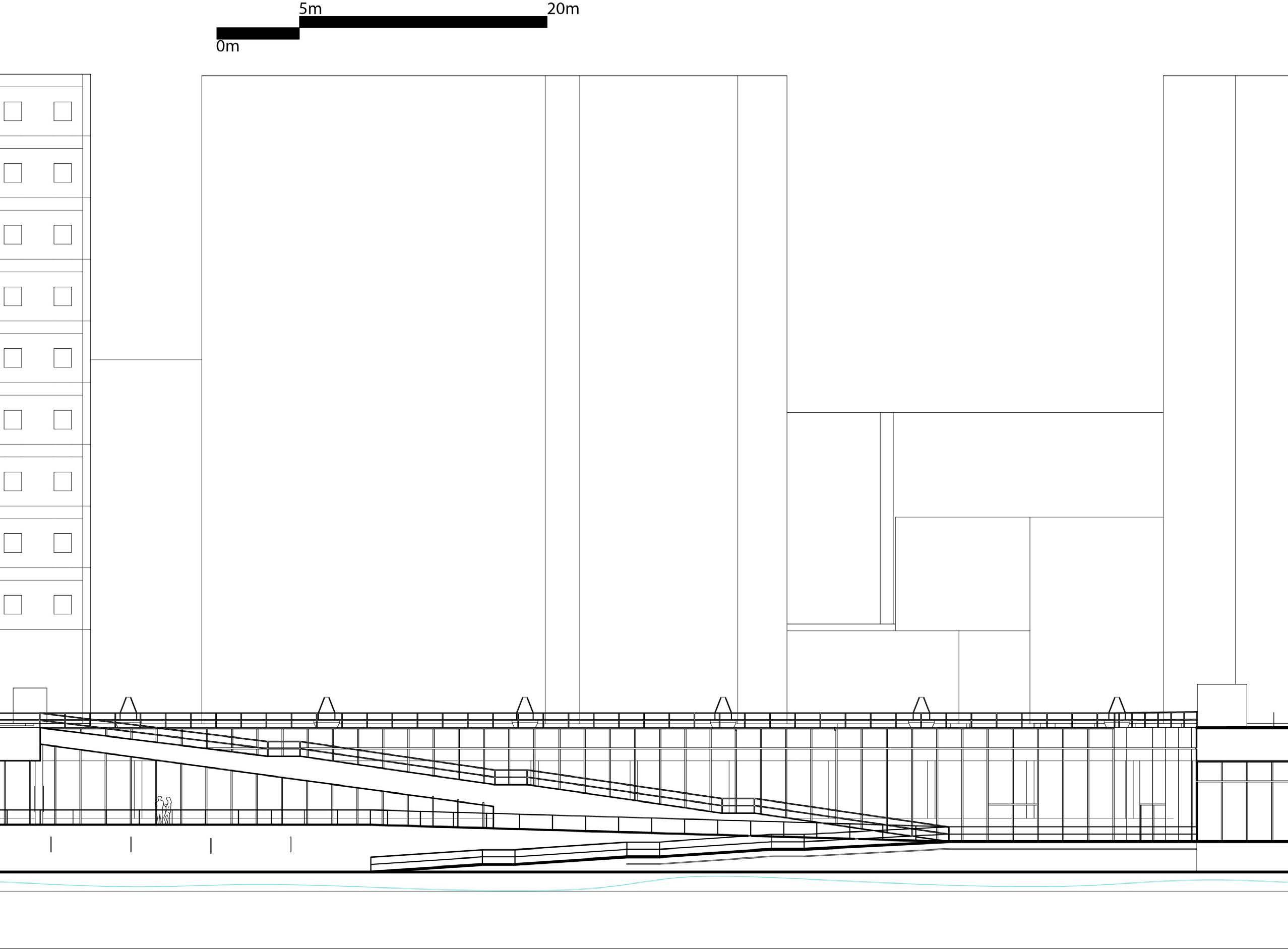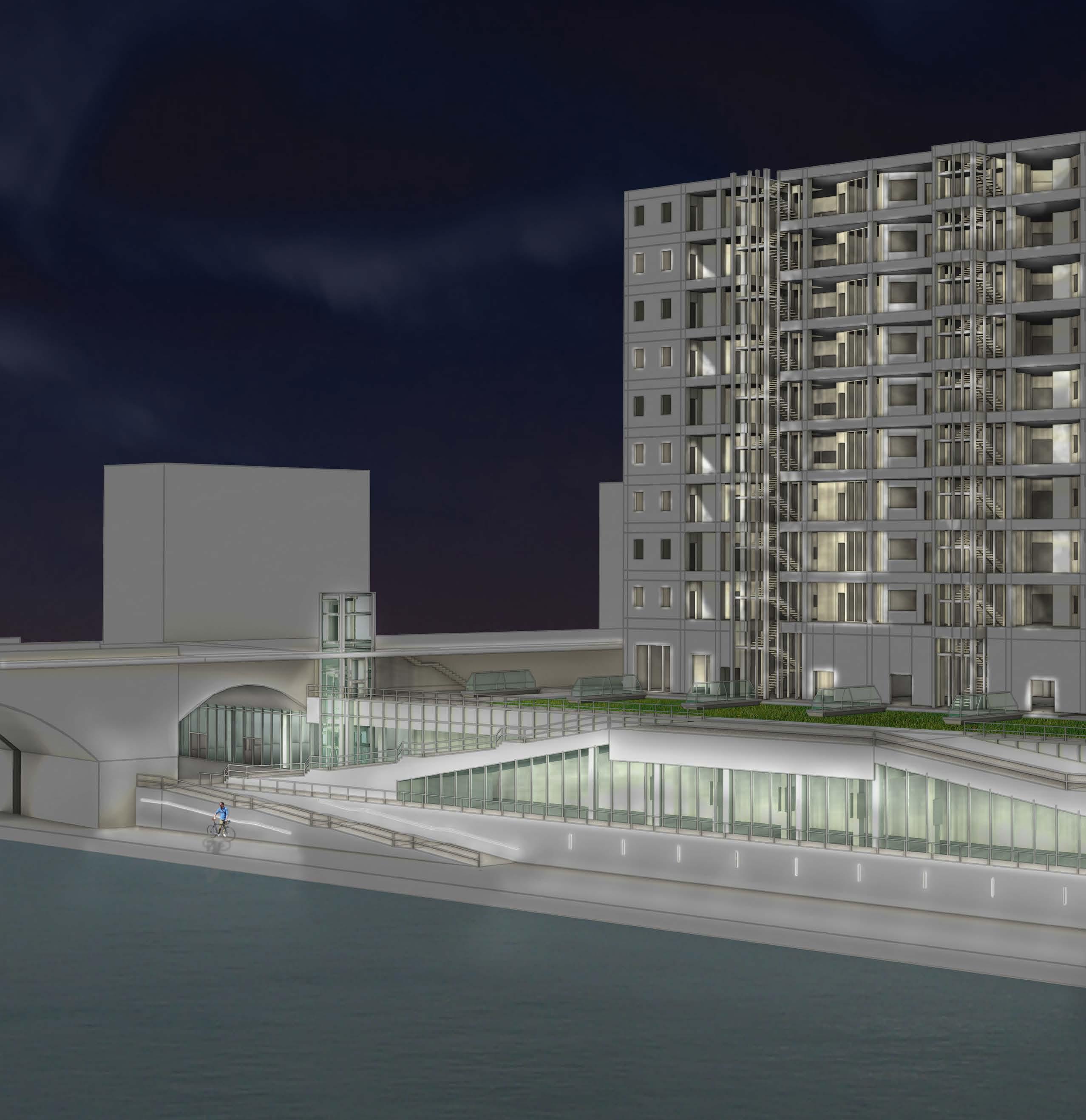 Residential building and river front with public space