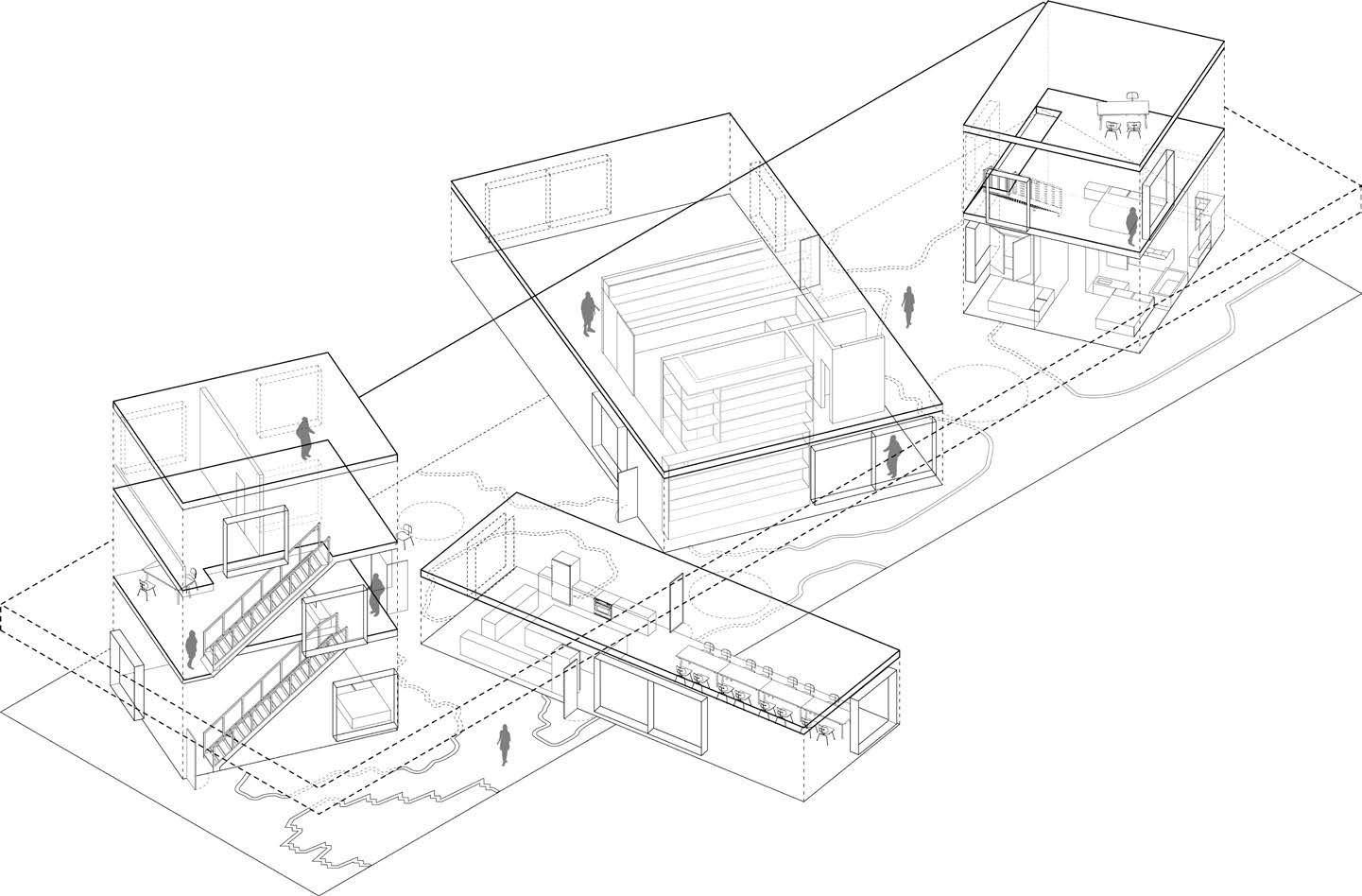 Exploring ways to show connectivity in drawings for West of West Architectural firm through isometric diagramming and floor plan. House of four parts project.
