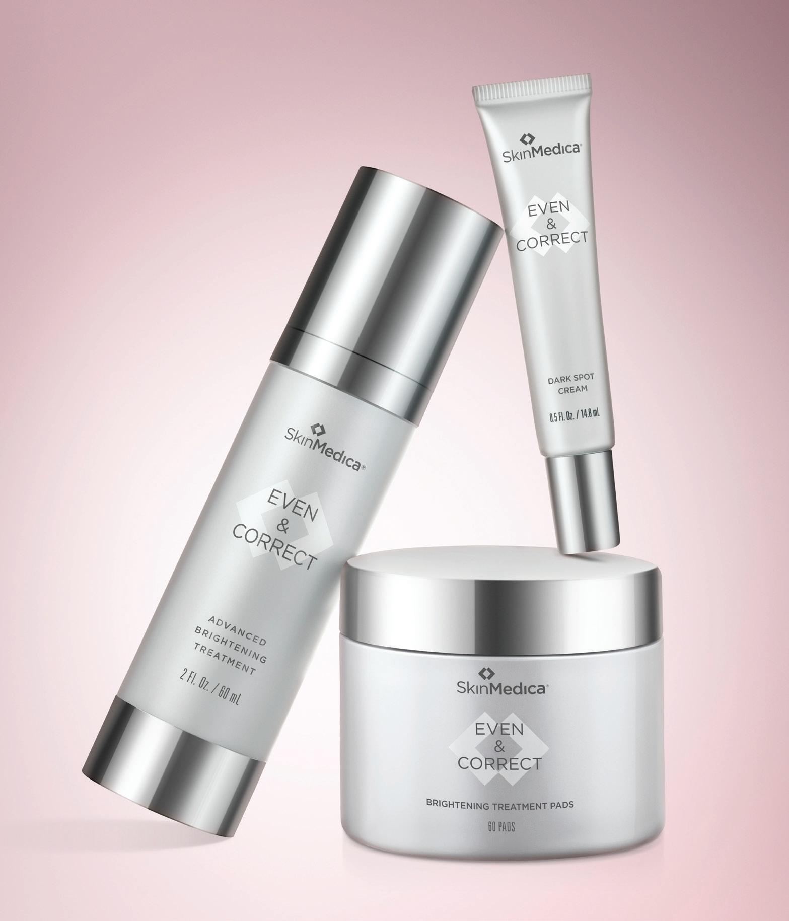 Sunburn alert: Even & Correct Brightening Treatment Pads and Even & Correct Dark Spot Cream contain an alpha-hydroxy acid (AHA) that may increase your skin’s sensitivity to sunburn. Use a sunscreen and limit sun exposure while using these products and for a week following discontinuation. Use a sunscreen with an SPF of 30 or higher during any sun exposure when using Even & Correct Advanced Brightening Treatment. Most SkinMedica® products are intended to meet the FDA’s definition of a cosmetic product, an article applied to the human body to cleanse, beautify, promote attractiveness, and alter appearances. These SkinMedica® products are not intended to be drug products that diagnose, treat, cure, or prevent any disease or condition. These products have not been approved by the FDA, and the statements here have not been evaluated by the FDA.