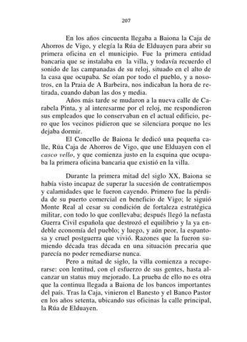 En los años cincuenta llegaba a Baiona la Caja de Ahorros de Vigo, y elegía la Rúa de Elduayen para abrir su primera oficina en el municipio. Fue la primera entidad bancaria que se instalaba en la villa, y todavía recuerdo el sonido de las campanadas de su reloj, situado en el alto de la casa que ocupaba. Se oían por todo el pueblo, y a nosotros, en la Praia de A Barbeira, nos indicaban la hora de retirada, cuando daban las dos y media. Años más tarde se mudaron a la nueva calle de Carabela Pinta, y al interesarme por el reloj, me respondieron sus empleados que lo conservaban en el actual edificio, pero que los vecinos pidieron que se silenciara porque no les dejaba dormir. El Concello de Baiona le dedicó una pequeña calle, Rúa Caja de Ahorros de Vigo, que une Elduayen con el casco vello, y que comienza justo en la esquina que ocupaba la primera oficina bancaria que existió en la villa. Durante la primera mitad del siglo XX, Baiona se había visto incapaz de superar la sucesión de contratiempos y calamidades que le fueron cayendo. Primero fue la pérdida de su puerto comercial en beneficio de Vigo; le siguió Monte Real al cesar su condición de fortaleza estratégica militar, con todo lo que conllevaba; después llegó la nefasta Guerra Civil española que destrozó el equilibrio y la ya endeble economía del pueblo; y luego, y aún peor, la espantosa y cruel postguerra que vivió. Razones que la fueron sumiendo década tras década en una situación precaria que parecía no poder remediarse nunca. Pero a mitad de siglo, la villa comienza a recuperarse: con lentitud, con el esfuerzo de sus gentes, hasta alcanzar un status muy mejorado. La prueba de ello no es otra que la continua llegada a Baiona de los bancos importantes del país. Tras la Caja, vinieron el Banesto y el Banco Pastor en los años setenta, ubicando sus oficinas la calle principal, la Rúa de Elduayen.