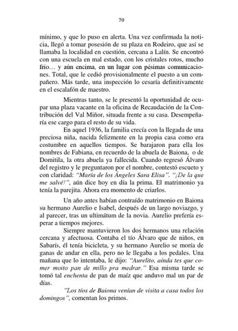 mínimo, y que lo puso en alerta. Una vez confirmada la noticia, llegó a tomar posesión de su plaza en Rodeiro, que así se llamaba la localidad en cuestión, cercana a Lalín. Se encontró con una escuela en mal estado, con los cristales rotos, mucho frío… y aún encima, en un lugar con pésimas comunicaciones. Total, que le cedió provisionalmente el puesto a un compañero. Más tarde, una inspección lo cesaría definitivamente en el escalafón de maestro. Mientras tanto, se le presentó la oportunidad de ocupar una plaza vacante en la oficina de Recaudación de la Contribución del Val Miñor, situada frente a su casa. Desempeñaría ese cargo para el resto de su vida. En aquel 1936, la familia crecía con la llegada de una preciosa niña, nacida felizmente en la propia casa como era costumbre en aquellos tiempos. Se barajaron para ella los nombres de Fabiana, en recuerdo de la abuela de Baiona, o de Domitila, la otra abuela ya fallecida. Cuando regresó Álvaro del registro y le preguntaron por el nombre, contestó escueto y con claridad: “María de los Ángeles Sara Elisa”. “¡De la que me salvé!”, aún dice hoy en día la prima. El matrimonio ya tenía la parejita. Ahora era momento de criarlos. Un año antes habían contraído matrimonio en Baiona su hermano Aurelio e Isabel, después de un largo noviazgo, y al parecer, tras un ultimátum de la novia. Aurelio prefería esperar a tiempos mejores. Siempre mantuvieron los dos hermanos una relación cercana y afectuosa. Contaba el tío Álvaro que de niños, en Sabarís, él tenía bicicleta, y su hermano Aurelio se moría de ganas de andar en ella, pero no le llegaba a los pedales. Una mañana que lo intentaba, le dijo: “Aurelito, aínda tes que comer moito pan de millo pra medrar.” Esa misma tarde se tomó tal enchenta de pan de maíz que anduvo mal un par de días. ”Los tíos de Baiona venían de visita a casa todos los domingos”, comentan los primos.