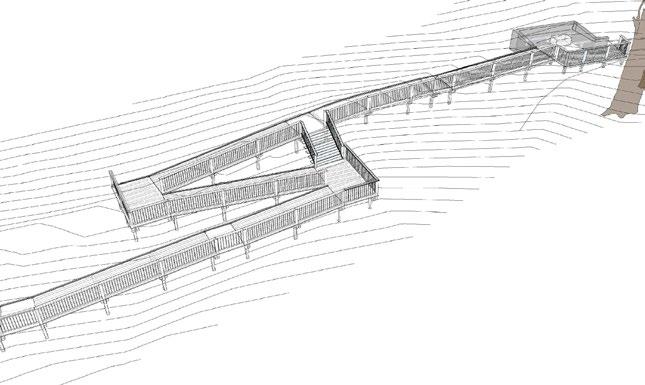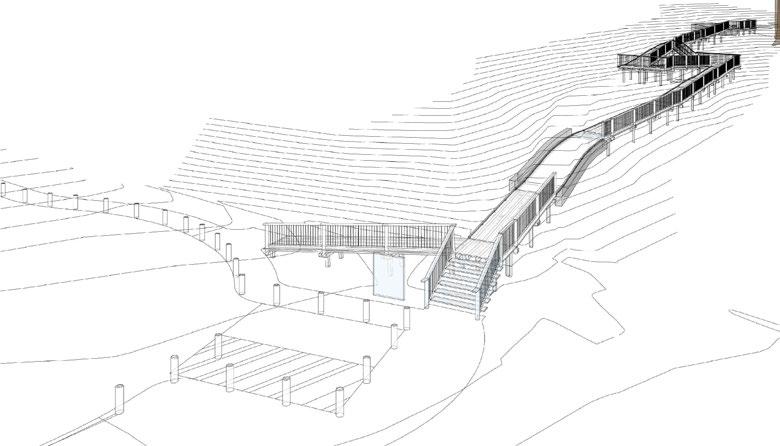 The design utilises the former rail cut to install, off the embankment, a series of shallow cast concrete and grass terraces to create an informal amphitheatre overlooking the significant remaining boulders where reenactment of the event occurs annually.