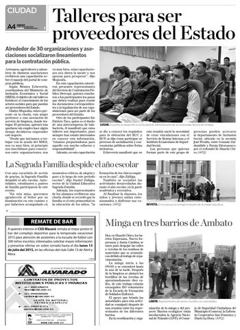 va muy bien, estas capacitacioAPORTES 01/11/2014 nes nos abren la mente y nos APORTES 01/11/2014 apoyan para prosperar”, dijo Moposita. APORTES 01/08/2014 En esta capacitación estuvieron presentes representantes APORTES 01/11/2014 del Servicio de Contratación Pública (Sercop), quienes enseñaAPORTES 01/11/2014 ron a los participantes los pasos APORTES que deben realizar para 02/07/2014 reunir los documentos correspondienAPORTES 01/08/2014 tes y la legalización de sus orgaAPORTES nizaciones para ser parte01/11/2014 de los proveedores del Estado. 02/01/2015 APORTES Otro de los participantes fue APORTES 01/08/2014 RESP. PATRONAL Patricio Taco, quien es el07/10/2014 dueño RESP. PATRONAL 23/10/2014 de una microempresa de talaAPORTES 01/08/2014 APORTES él manifestó que 01/08/2014 bartería, estos APORTES 01/11/2014 talleres son importantes, pues APORTES 01/08/2014 siempre APORTEShan estado interesados 01/08/2014 APORTES 01/08/2014 en conocer esta información, APORTES 02/10/2014 “estamos preparándonos para APORTES 02/07/2014 aquello y PORTES con mucho esfuerzo 02/10/2014 APORTES 01/08/2014 responsabilidad”. APORTES 02/07/2014 Además, en esta capacitación APORTES 01/08/2014