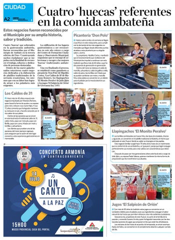 Estos negocios fueron reconocidos por el Municipio por su amplia historia, sabor y tradición. Cuatro ‘huecas’ que sobresalen en la gastronomía ambateña, fueron reconocidas por el Municipio de Ambato en la tercera edición del foro ‘Construyendo sueños ciudadanos’ que se impulsa con la finalidad de reconocer el trabajo, esfuerzo y dedicación de personas destacadas. Dentro de los nueve galardonados estuvieron cuatro negocios dedicados a la elaboración de platillos tradicionales de la serranía ecuatoriana, los mismos que con su labor han logrado atraer a los paladares más exigentes.