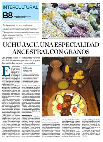 especiales, pues las familias preparan una variedad de alimentos para repartir a sus invitados. Durante el Inti Raymi se consume borrego o carne de res, con habas y mote. A los compadres se les brinda uchu jacu con cuy y a los bailarines papas con habas, lo mismo que a los familiares y los invitados especiales. El Día de los Difuntos se va con comida al cementerio, la misma que se prepara la noche anterior. El festín va dedicado al muerto y, por esta razón, se lleva el plato favorito de este y se lo ‘comparte’. En esta ocasión el menú principal para conmemorar al fallecido es la colada de uchu jacu. Producción agrícola