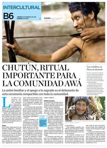 tanto, evitar su presencia es una mágico-religiosa. forma de mantener seguros a los individuos y tratar de que ellos Sabiduría y técnica no se expongan a peligros que La curación del Chutún está ropueden haber en ciertos lugares deada de actitudes misteriosas, de la selva. ya que se trata de un rito que reaLos síntomas que prescriben firma la eficacia simbólica. que una persona esté atravesanEste intenso tratamiento se do por ‘el mal’ son dolores de ca- realiza en horas de la tarde dubeza e intenso resfrío que, según rante tres o cinco días seguidos. la tradición oral de este pueblo, En cada ocasión, el curandero hace que los enfermos se frota el tórax con tabaco ‘mantengan calentándose EL DATO y ‘chapil’, elementos conen el Sol’. siderados, según la sabiAnte los indicios y las duría de esta población insíntomas de dígena, como importantes señales de la dolencia, Los este mal se asoinmediatamente se llama cian a lo que aportes de poder mágico. se al curandero tradicional, comúnmente El último día se extrae lo conoce como quien le toma el pulso y ‘mal aire’. definitivamente el Chuluego decide si es el Chutún con la asistencia de tún el causante de esto, familiares y vecinos. Al pues el éxito para sacarlo de su iniciar la reunión el paciente se cuerpo dependerá unicamente sienta y observa el transcurrir de de la habilidad y conocimientos la fiesta. Todos toman, comen y que él tenga. Si fracasa, se pone bailan. en duda su sabiduría y habiliEl curandero solo bebe, pordad de aplacar poderes sobre- que con su disciplina enseña a naturales y, como consecuencia, todos que la abstinencia no es pierde los privilegios sociales y una privación, sino la forma de materiales que genera la práctica acumular poder y la garantía de