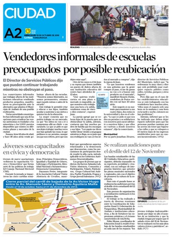 ños al mercado a comprar”, dijo dejen estar aquí”. Otro de los casos es el de Juan la esposa de Juan. “Lo que nosotros vendemos y su esposa que tienen también un puesto de dulces afuera de es una golosina que la gente una institución educativa del compra al paso, si me da ganas no voy a ir a buscar este centro hace alrededor de producto en el mercado”, 12 años. EL DATO manifestó Rosario Dután, “Que quieran reubiConsejo vendedora de frutos vercarnos en una plaza o El Municipal de des con sal hace 30 años mercado es imposible, ya Seguridad Ciudadana realique nosotros solo trabaja- za operativos de atrás. de inforEste negocio es su susmos una hora a la salida, control males. tento para mantener a sus vendemos cosas de cinco cuatro hijos, dos están en o diez centavos”, expresó la universidad y dos en el coleJuan. La pareja agregó que se co- gio. “Lo que yo pido es que nos locan lejos de la puerta para no den un permiso y se solidaricen obstaculizar la salida, además, con nosotros para sacar adelancontaron que hay muchos pa- te a nuestros hijos y que ellos dres de familia que les encargan no vuelvan a donde nosotros a sus hijos. “Los papás me dicen estamos”, dijo la comerciante. ‘señito’ deme viendo a mi guagua mientras yo llego, no es justo que Municipalidad nos reubiquen no van a ir los ni- Por su parte Jonathan Álvarez,