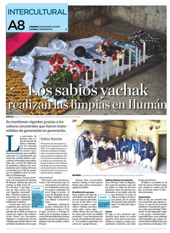 a parroquia de Ilumán está a 7 km al suroeste de Ibarra (ImbabuIlumán es una comunidad muy ra). Es conocida conocida por la presencia de ‘yachac Taitas’. Es un pueblo donde por mupor su excelencia chos años se dedicaron a la elaboen cuanto a proración y el procesamiento de la lana ducción artesanal, pero también para convertirla en sombreros. Ahosobresale la popularidad que ra se los hace de tonos llamativos y tienen los yachak (sabios, conosu destino son, principalmente, los cedores), personajes trascendenturistas. Se fabrican unos 50 diarios tales que, a través de objetos de por familia y se los vende o entrega la naturaleza, aplican sus conoa diversos almacenes. Además de la cimientos para realizar diversas artesanía, Ilumán es atractivo por su ceremonias con el fin de manteentorno natural y paisajístico. ner el equilibrio entre la sociedad y la Pachamama. José Joaquín Picuasi perte- otras carreras”. Para hacer una curación innece a la Asociación de Yachaks de Ilumán. Afirma que para ser vocan a las elevaciones que se encuentran cerca del secyachak se debe tener de tor, localizadas en los cua12 a 62 años. Y que algu- EL DATO tro puntos cardinales: El nos de ellos nacen con cerro Negro al norte, el este “singular y preciado” martes y cerro de Mojanda al sur, don. “Nosotros somos ta- Los viernes son los taranietos de Atahualpa ideales para que el ‘Taita’ Imbabura al este limpia cure el y la ‘Mama’ Cotacachi al y practicamos medicina la estrés y otros males que aque- oeste. tradicional y mística”. jan a las persoAsímismo, solicitan la Cuenta que entre los nas, afirman los ayuda a elementos de la requisitos para pertene- yachaks. naturaleza como el Sol, cer a esta agrupación, además de la edad, se toman en el agua, la tierra y el fuego, lo cuenta los signos del zodiaco: cuales, por su energía, ayudan a Aries, Tauro, Leo, Escorpión, curar diversas dolencias, incluso Sagitario y Capricornio son los aquellas a las que los médicos ca“elegidos para poder ejercer esta talogan como incurables, refiere actividad, los demás sirven para Picuasi.
