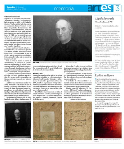 El Centro Nacional de Bellas Artes Acuerda: Hacer presente su pública condolencia por el fallecimiento del distinguido artista nacional, pintor señor Wenceslao Cevallos; en Guayaquil el presente 13; y dejar constancia de su profundo agradecimiento a la prensa de Guayaquil y en especial al Diario “El Guante” por la forma espontánea y humanitaria y noble con q´ ha sabido honrar los restos del esclarecido compañero Cevallos. Dado en la Sala de sesiones en Quito, 15 de Octubre de 1924. Pintura. El retrato del padre Luis Sodiro fue ejecutado por el artista Cevallos.
