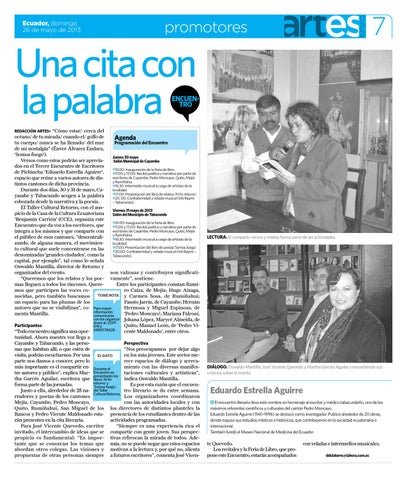 REDACCIÓN ARTES• “Cómo estar/ cerca del océano/ de tu mirada/ cuando el/ golfo de Agenda tu cuerpo/ nunca se ha llenado/ del mar Programación del Encuentro de mi nostalgia” (Énver Álvarez Endara, ‘Somos fuego’). Jueves 30 mayo Versos como estos podrán ser apreciaSalón Municipal de Cayambe dos en el Tercer Encuentro de Escritores Inauguración de la Feria de libro. °10:00: de Pichincha ‘Eduardo Estrella Aguirre’, 11:00 y 15:00: Recital poético y narrativo por parte de °escritores de Cayambe, Pedro Moncayo, Quito, Mejía espacio que reúne a varios autores de disy Rumiñahui. tintos cantones de dicha provincia. 16:30: Intermedio musical a cargo de artistas de la °localidad. Durante dos días, 30 y 31 de mayo, CaPresentación del libro de relatos ‘Al fin retorno’. °17:00: yambe y Tabacundo acogen a la palabra 20: 00: Confraternidad y velada musical (Inti Raymi ° esbozada desde la narrativa y la poesía. – Tabacundo). El Taller Cultural Retorno, con el ausViernes 31 mayo de 2013 picio de la Casa de la Cultura Ecuatoriana Salón del Municipio de Tabacundo ‘Benjamín Carrión’ (CCE), organiza este Inauguración de la Feria de libro °10:00: Encuentro que da voz a los escritores, que 11:00 y 15:00: Recital poético y narrativo por parte de °escritores de Cayambe, Pedro Moncayo, Quito, Mejía integra a los mismos y que comparte con y Rumiñahui. el público de esos cantones, “descentrali16:30: Intermedio musical a cargo de artistas de la °localidad. zando, de alguna manera, el movimienPresentación del libro de poesía ‘Somos fuego’. °17:00: to cultural que suele concentrarse en las 20:00: Confraternidad y velada musical (Inti Raymi – °Tabacundo). denominadas ‘grandes ciudades’, como la capital, por ejemplo”, tal como lo señala Oswaldo Mantilla, director de Retorno y organizador del evento. son valiosas y contribuyen significati“Queremos que los relatos y los poe- vamente”, sostiene. mas lleguen a todos los rincones. QuereEntre los participantes constan Ramimos que participen las voces coro Caiza, de Mejía; Hugo Aizaga, nocidas, pero también buscamos TOME NOTA y Carmen Sosa, de Rumiñahui; un espacio para las plumas de los Fausto Jarrín, de Cayambe; Hernán autores que no se visibilizan”, co- Para mayor Hermosa y Miguel Espinosa, de información menta Mantilla. ‘Pedro Moncayo’; Mariana Falconí, comunicarse con los organiza- Johana López, Marycé Almeida, de dores al: 2297Quito; Manuel León, de ‘Pedro ViParticipantes 041 y cente Maldonado’, entre otros. “Todo encuentro significa una opor- 0980178428. tunidad. Ahora nuestra voz llega a Cayambe y Tabacundo, y las persoPerspectiva nas que habitan allí, o que estén de “Nos preocupamos por dejar algo visita, podrán escucharnos. Por una El Dato en los más jóvenes. Este sector meparte nos damos a conocer, pero lo rece espacios de diálogo y acercamás importante es el compartir en- Durante el miento con las diversas manifestre autores y público”, explica Mar- Encuentro se taciones culturales y artísticas”, presentarán los tha Garcés Aguilar, escritora que libros ‘Al fin indica Oswaldo Mantilla. retorno’ y forma parte de las jornadas. Es por esta razón que el encuen‘Somos fuego’, Junto a ella, alrededor de 25 na- del Taller tro literario se da entre semana. Cultural Retorno. rradores y poetas de los cantones Los organizadores coordinaron Mejía, Cayambe, Pedro Moncayo, con las autoridades locales y con Quito, Rumiñahui, San Miguel de los los directores de distintos planteles la Bancos y Pedro Vicente Maldonado esta- presencia de los estudiantes dentro de las rán presentes en la cita literaria. actividades programadas. Para José Vicente Quevedo, escritor “Siempre es una experiencia rica el invitado, el intercambio de ideas que se compartir con gente joven. Sus perspecpropicia es fundamental: “Es impor- tivas refrescan la mirada de todos. Adetante que se conozcan los temas que más, no se puede negar que estos espacios abordan otros colegas. Las visiones y motivan a la lectura y, por qué no, alienta propuestas de otras personas siempre a futuros escritores”, comenta José Vicen-
