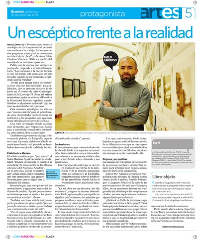 Un escéptico frente a la realidad • “Presentar una muestra antológica te da la oportunidad de abrir una ventana a tu trabajo. Así surgen varias preguntas, como ¿cuál es la columna vertebral de tu obra?”, reflexiona Pablo Cardoso (Cuenca, 1965), en medio del montaje de su próxima exposición. Pablo, con la sonrisa que siempre lo acompaña, responde a su autointerrogatorio: “La conclusión a la que he llegado es que mi trabajo está unido por un hilo invisible cargado de un profundo escepticismo ante la realidad”. ‘Teoría para actuar antes de tiempo’ se cose con este ‘hilo invisible’. Esta exhibición, que se presenta desde el 19 de junio en el Centro de Arte Contemporáneo (CAC), recoge 79 obras del artista ecuatoriano, quien se alzó con el Premio a la Trayectoria Mariano Aguilera, convirtiéndose en el primero en hacerlo bajo las nuevas modalidades del concurso. Esta muestra antológica no sólo es una ‘ventana abierta’ para el galardonado, pues el espectador puede avizorar los territorios y las geografías que aparecen desde el horizonte creativo de Cardoso. Una serie de paisajes donde asoman más preguntas que respuestas, dando paso a una triada comunicativa interactiva, entre artista, obra y observador. También está presente su diálogo crítico entre la pintura y la fotografía, espacio en el que hace más visible ese hilo de escepticismo donde, cual péndulo, se bambolean los conceptos de realidad y ficción. REDACCIÓN ARTES