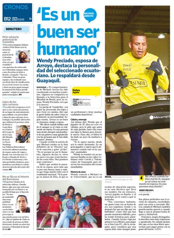 Wendy Preciado, esposa de Arroyo, destaca la personalidad del seleccionado ecuatoriano. Lo respaldará desde Guayaquil. • El comportamiento de Michael Arroyo ha sido cuestionado en muchas ocasiones. Algunos no comparten su llamado a la Selección para el Mundial de Brasil, pero su esposa, Wendy Preciado, cree que sí lo merece. La pareja de ‘Gambetita’, con quien ha procreado dos hijos y uno viene en camino, dice que la gente habla sin saber cómo es realmente su personalidad. Según cuenta, Arroyo es un buen ser humano, amigo y esposo. “Me afecta cuando hablan mal de él, aunque yo sé cómo es realmente mi esposo. Es una persona muy atenta, siempre está pendiente de sus padres y muy agradecido con las personas que le han dado la mano”, destaca. Cuando recibió la noticia de que Michael estaba en la lista definitiva de la ‘Tricolor’ saltó de emoción y gritó ‘¡al fin!’. “No sé porque no me lo llamaban, algunos decían sí, otros no, pero creo que venía haciendo las cosas bien. Nos pusimos muy contentos”. Indicó que sentirá la ausencia de su esposo, pero sabe que es por una buena causa y espera que tenga mucho éxito con el combinado nacional. “Yo lo pongo en manos de Dios, sé que es