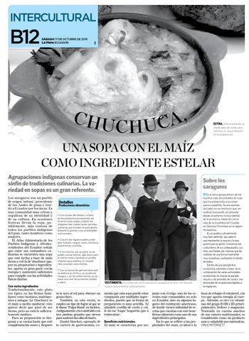 UNA SOPA CON EL MAÍZ COMO INGREDIENTE ESTELAR Agrupaciones indígenas conservan un sinfín de tradiciones culinarias. La variedad en sopas es un gran referente. Los saraguros son un pueblo de origen ‘mitma’, procedente de los Andes de puna y traído a Ecuador por los incas. Es una comunidad muy celosa y orgullosa de su identidad y de su cultura. En ocasiones festivas llevan la ropa, posiblemente, más costosa de todos los pueblos indígenas del país, tanto hombres como mujeres. El Atlas Alimentario de los Pueblos Indígenas y Afrodescendientes del Ecuador señala que entre sus costumbres culinarias se encuentra una sopa que está hecha a base de maíz tierno y col: la de ‘chuchuca’ que, por su preparación e ingredientes, aporta en gran parte con la energía y nutrientes suficientes para cumplir con las actividades físicas diarias.