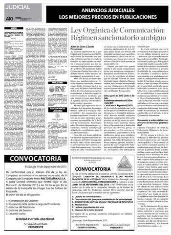 CONVOCATORIA Pastocalle 19 de Septiembre del 2013 De conformidad con el artículo 236 de la ley de Compañía, se convoca a los señores accionistas de la Compañía de Transporte Mixto PASTOCIATRANS S.A. A junta General ordinaria que tendrá lugar el día Martes 01 de Octubre 2013 a las 16 horas pm. En la oficina de la Compañía en el lugar tras del Coliseo de Pastocalle. El orden del día es el siguiente: 1.- Constatación del Quórum 2.- Instalación de la sesión a cargo del Presidente 3.- Informe del Presidente 4.- Informe del Gerente 5.- Asuntos varios