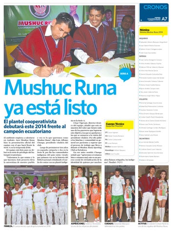 Mushuc Runa ya está listo El plantel cooperativista debutará este 2014 frente al campeón ecuatoriano El ambiente empieza a calentarse en Ambato. Ayer Mushuc Runa hizo la presentación oficial del equipo con el que hará frente la Serie A en la temporada 2014. El equipo está listo para su debut en la serie de privilegio del balompié ecuatoriano. “Valoramos lo que somos y lo que hacemos. Este proyecto eleva la autoestima de nuestro pueblo
